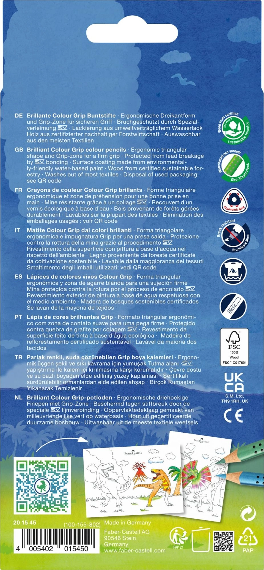 Atraskite kokybiškus spalvotus pieštukus vaikams ir suaugusiesiems: rinkinys Faber-Castell Colour Grip Dinosaurliai 10+3 siūlo ergonomišką trikampį korpusą, neslystančią laikymo zoną ir ryškias, sodrias spalvas sklandžiam spalvinimui. Dėl specialaus švino klijavimo (SV) pieštukai yra itin atsparūs lūžimui ir patogiai guli rankoje.