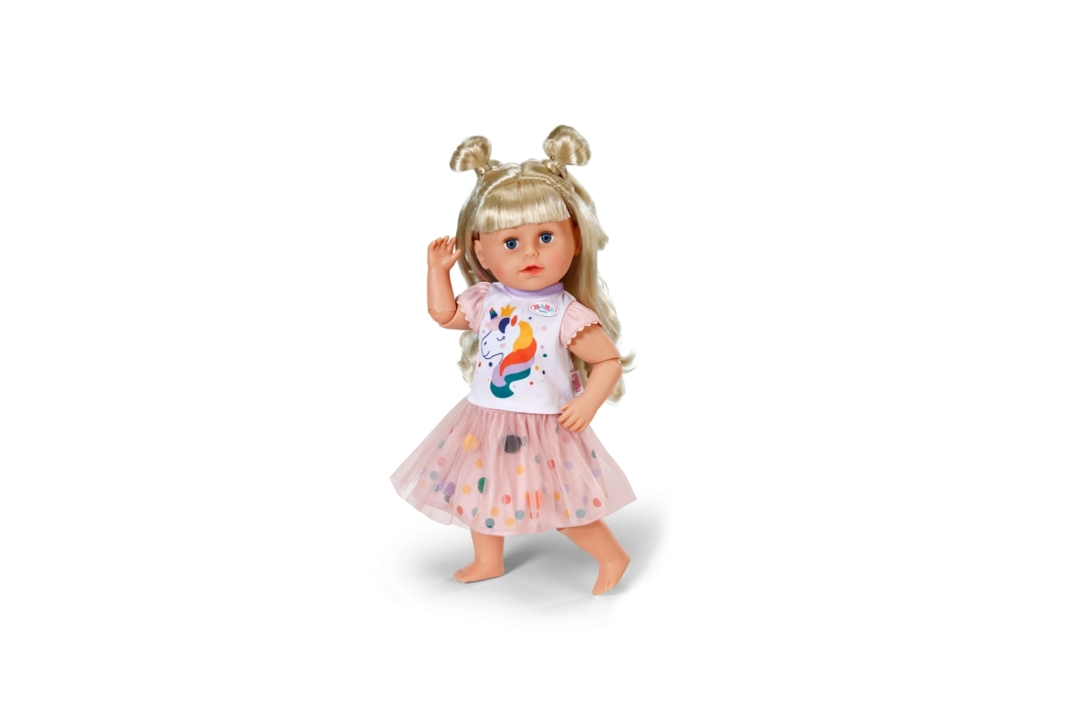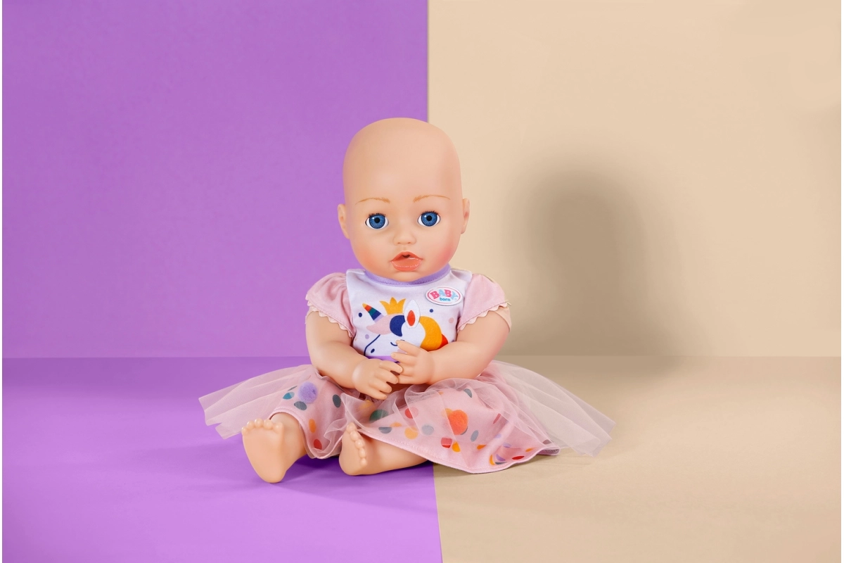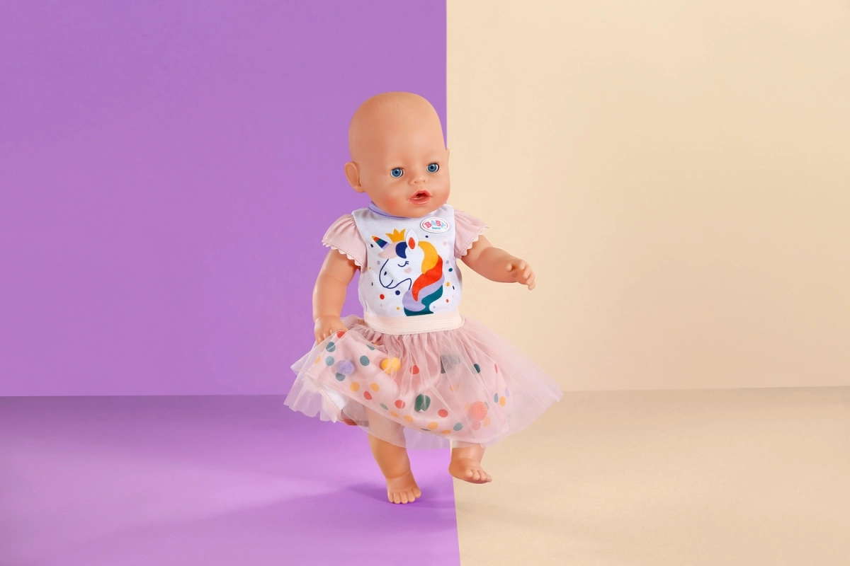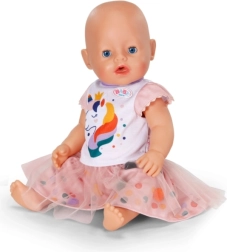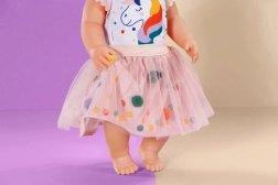 Padovanokite savo lėlei magišką stilių su išskirtine tutu suknele su vienaragio motyvu. Rinkinį sudaro balti trumpomis rankovėmis marškinėliai su žaismingu vienaragio atspaudu ir rožinis tiulio tutu sijonas su tikrais spalvotais pomponais po viršutiniu sluoksniu. Švelnių medžiagų derinys ir elastingas liemuo palengvina aprengimą ir užtikrina patogumą žaidžiant.