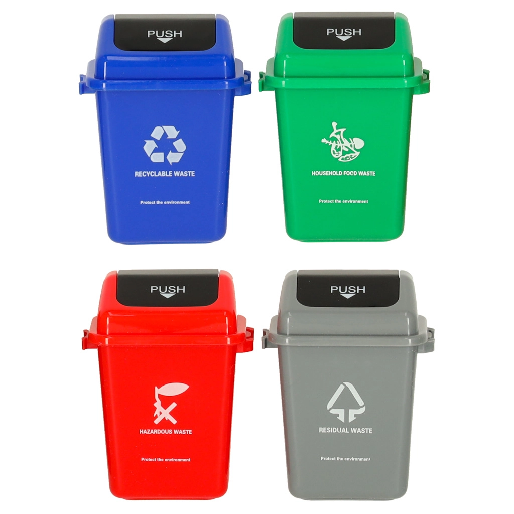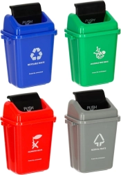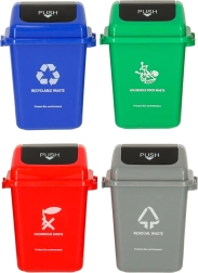 Keturios šiukšliadėžės iš tvirto plastiko su aiškiais simboliais ir spalvomis lengvai orientacijai. Jas galima sujungti į vieną eilę.
