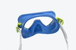 Mėlyna nardymo kaukė turi UV apsauginius lęšius ir reguliuojamą silikoninį dirželį, užtikrinantį patogumą ir saugumą po vandeniu.