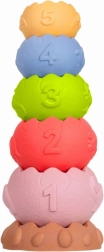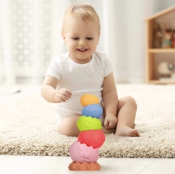 Pastelinės detalės lengvai sugriebiamos ir stabiliai dėliojamos į aukštą bokštą. Vaikai lavina akies–rankenos koordinaciją ir kantrybę kiekvienąkart statydami piramidę.