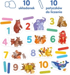 Žaidimas su dėlionėmis skatina žodyno plėtrą, vaizduotę ir vizualinį suvokimą. Vaikai gali įvardyti gyvūnėlius, kurti istorijas ir ieškoti skaičių savo aplinkoje. Rinkinys yra puiki pradžia mokytis skaičiuoti iki 10 ir pirmiesiems bandymams rašyti skaitmenis.