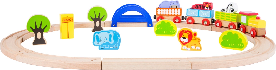Bėgių ovalas, tiltas, medžiai, krūmai, ZOO ženklas ir gyvūnų figūrėlės – viskas vienoje pakuotėje turtingam vaizduotės žaidimui.