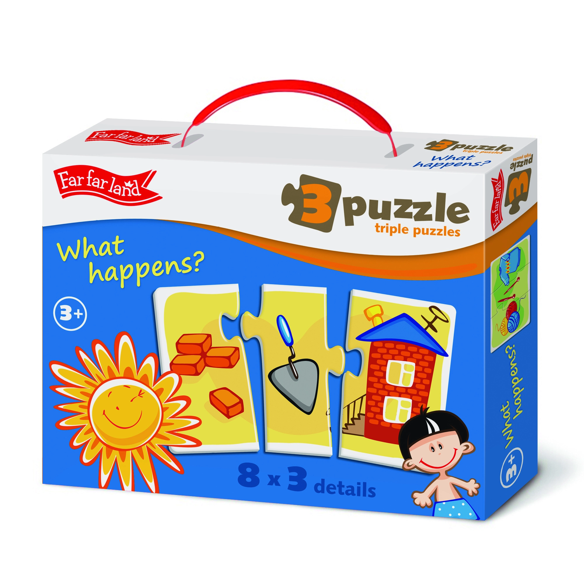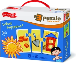Atraskite sumanų Far Far Land rinkinį, kuris žaismingai moko vaikus priskyrimo ir daiktų tarpusavio ryšių. Kiekvienas paveikslėlis padalytas į tris dalis, o užduotis – surasti teisingą tarpusavyje derančią trijulę. Dėliojimas skatina susikaupimą, kantrybę ir teikia džiaugsmo iš kiekvieno sėkmingai sudėlioto motyvo.