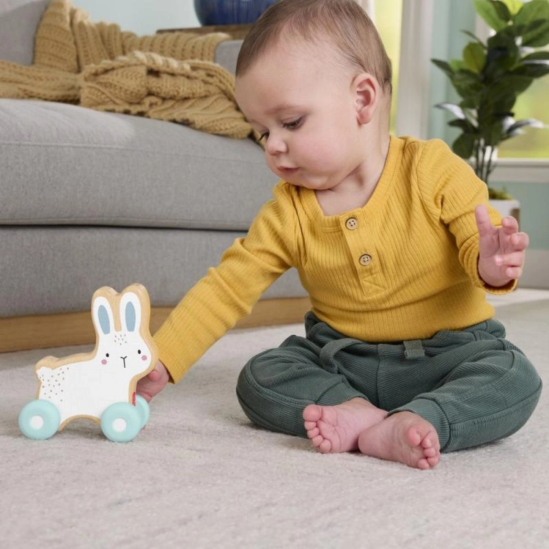 Mielas medinis triušiukas ant ratukų FISHER-PRICE idealiai tinka kūdikiams nuo 6 mėnesių. Dėl besisukančių ratukų, patogaus suėmimo ir FSC sertifikuotos medienos jis skatina smulkiosios ir stambiosios motorikos vystymąsi ir motyvuoja vaikus sėdėti bei ropoti paskui žaislą.