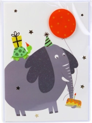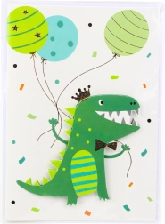 Linksmi vienaragio, dinozauro, dramblio ir varlės motyvai suteikia atvirukui žaismingumo ir džiaugsmo.