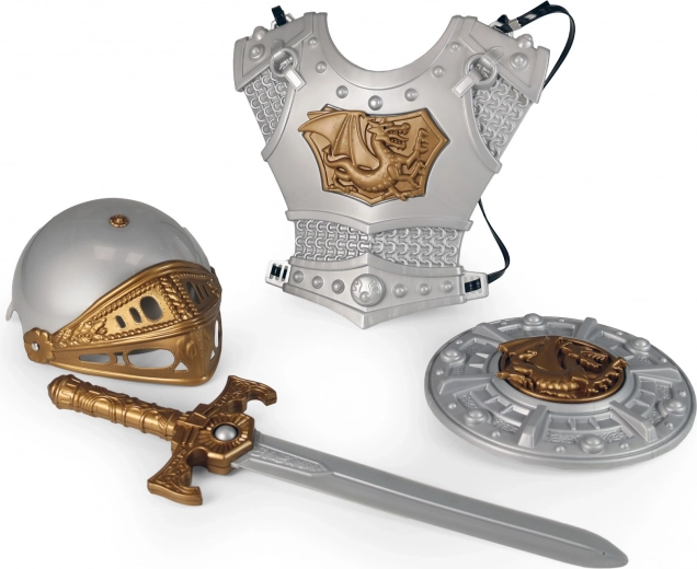 Paverskite žaidimą epiniu nuotykiu su šiuo pilnu vaikišku riterio rinkiniu. Jame yra šalmas, krūtinės šarvai, kardas ir skydas elegantiško sidabrinio ir auksinio derinio. Lengvas plastikas yra saugus ir patogus vaikams, o detalus apdirbimas su drakono motyvu skatina vaizduotę ir vaidmenų žaidimus namuose ir lauke.