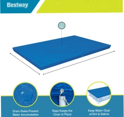 Bestway baseino uždangalas, kurio matmenys 224 cm x 154 cm, yra idealus antžeminio baseino, kurio dydis 221 cm x 150 cm, apsaugai nuo nešvarumų ir nepalankių oro sąlygų.