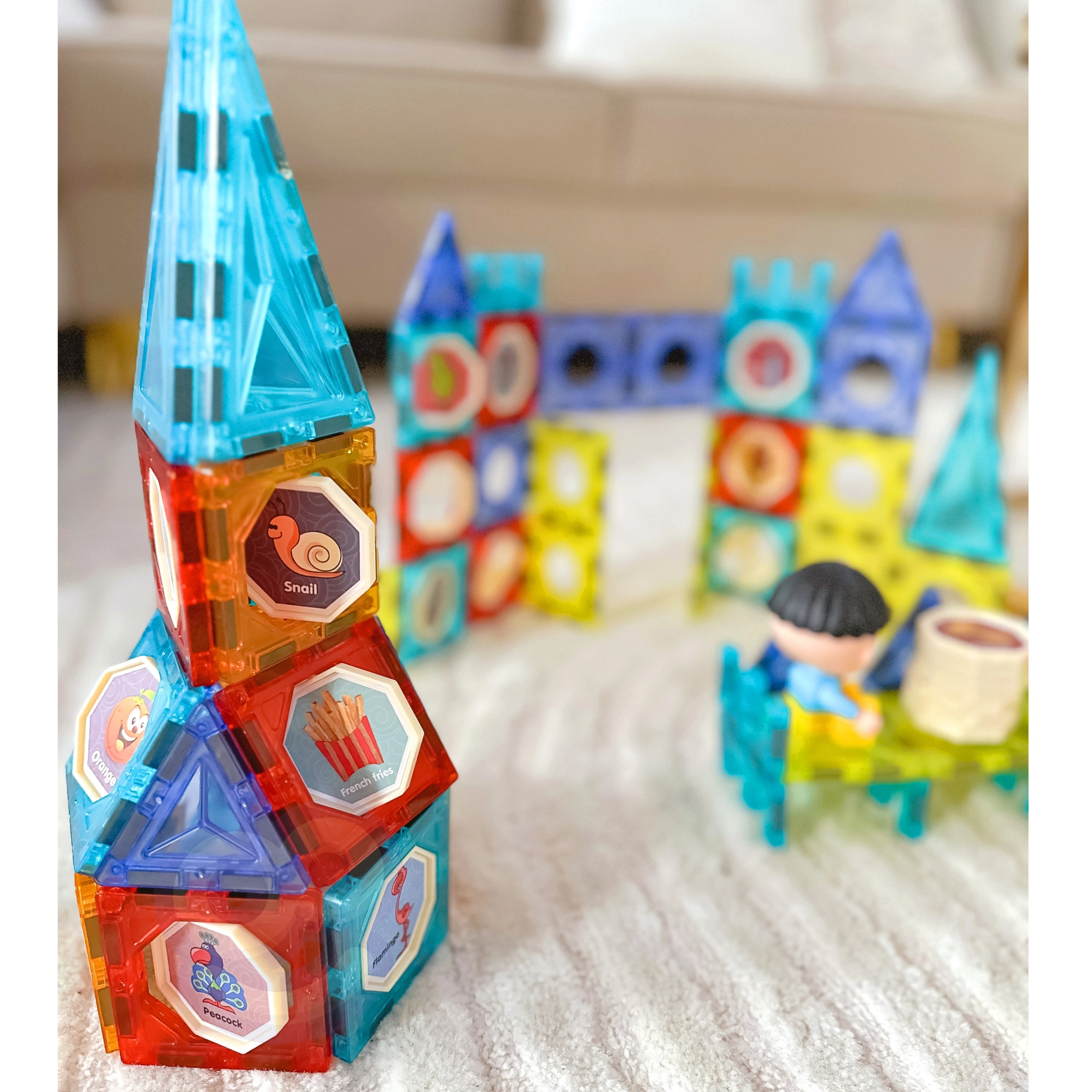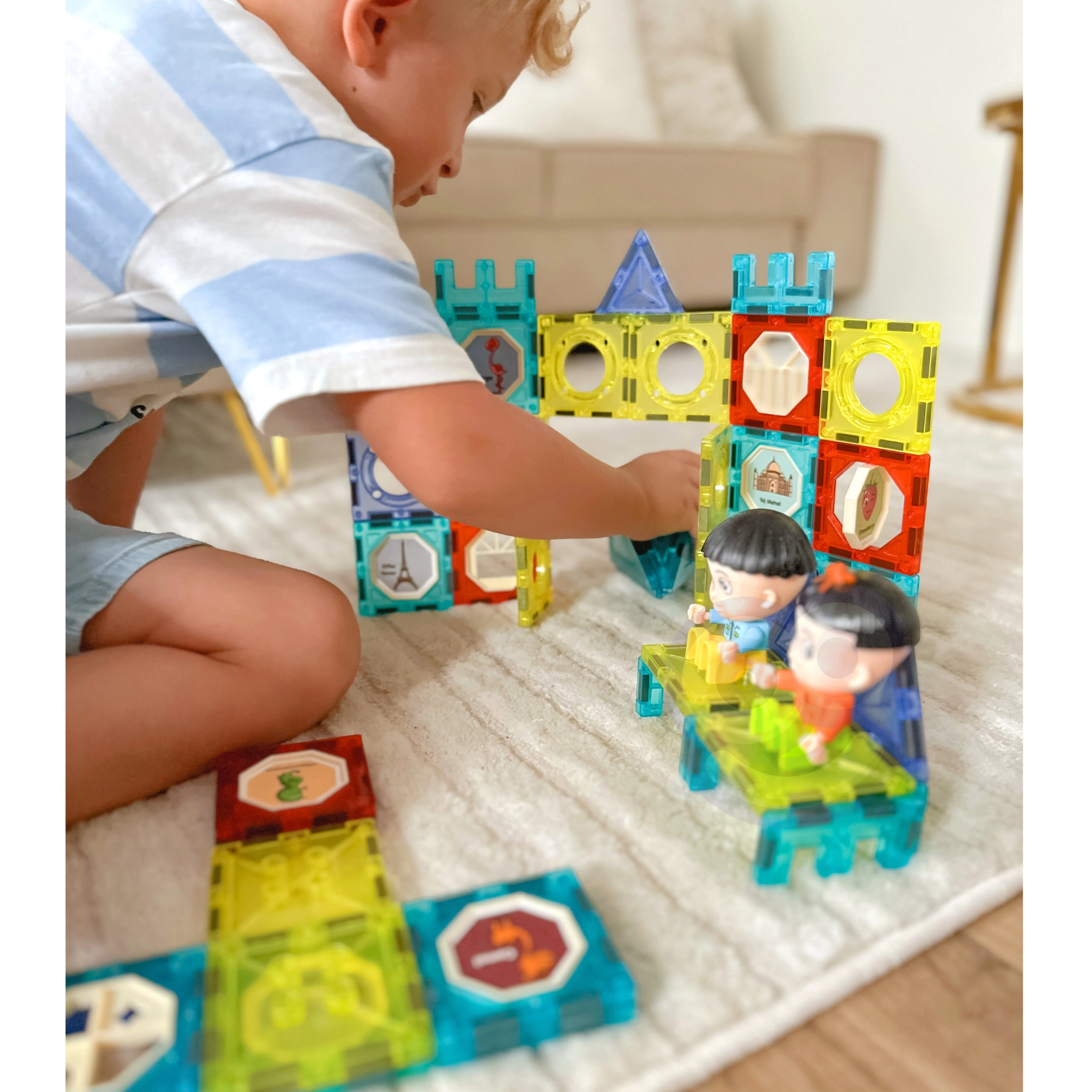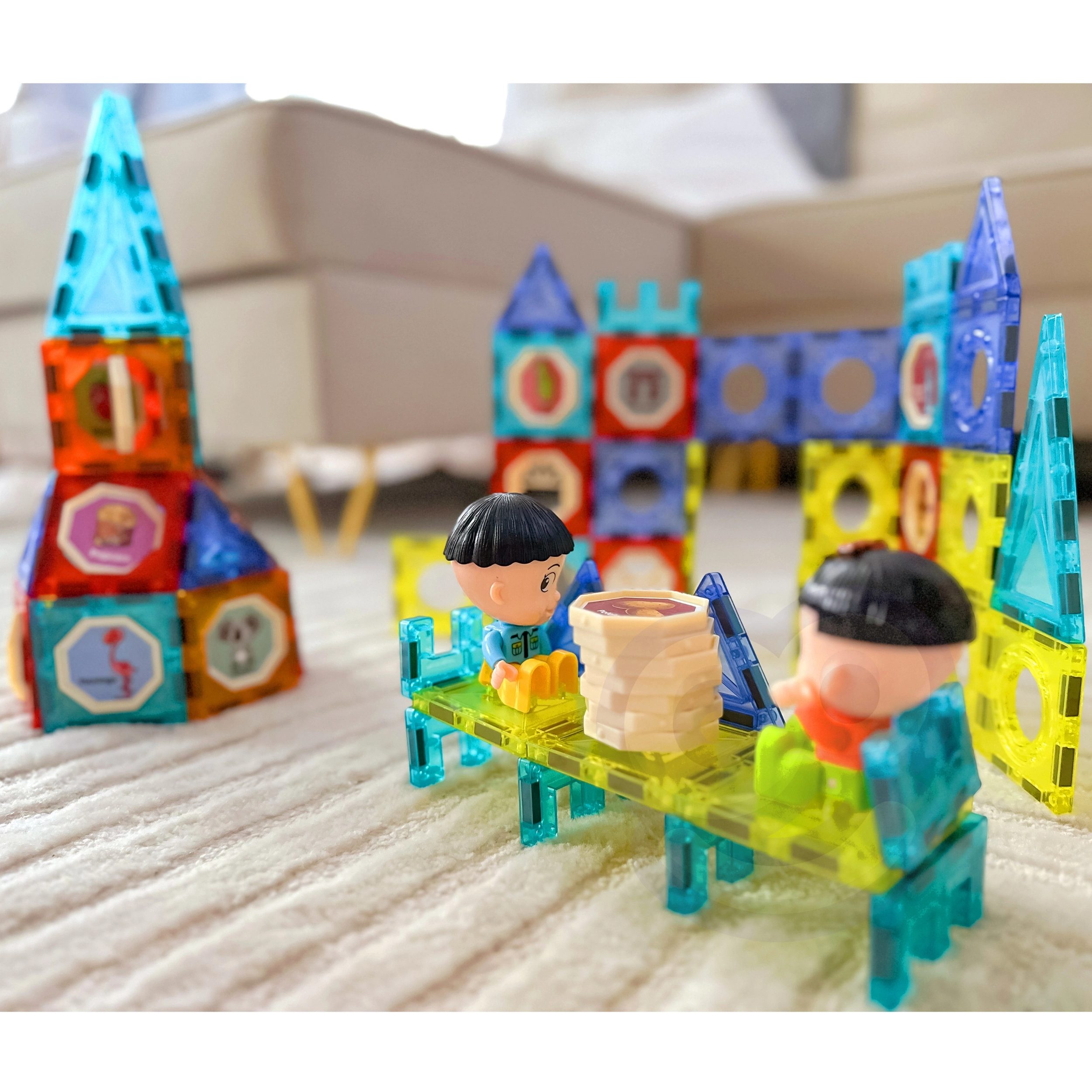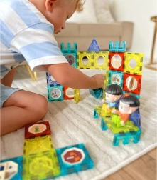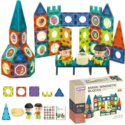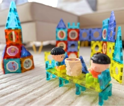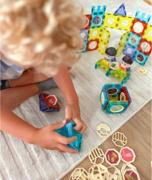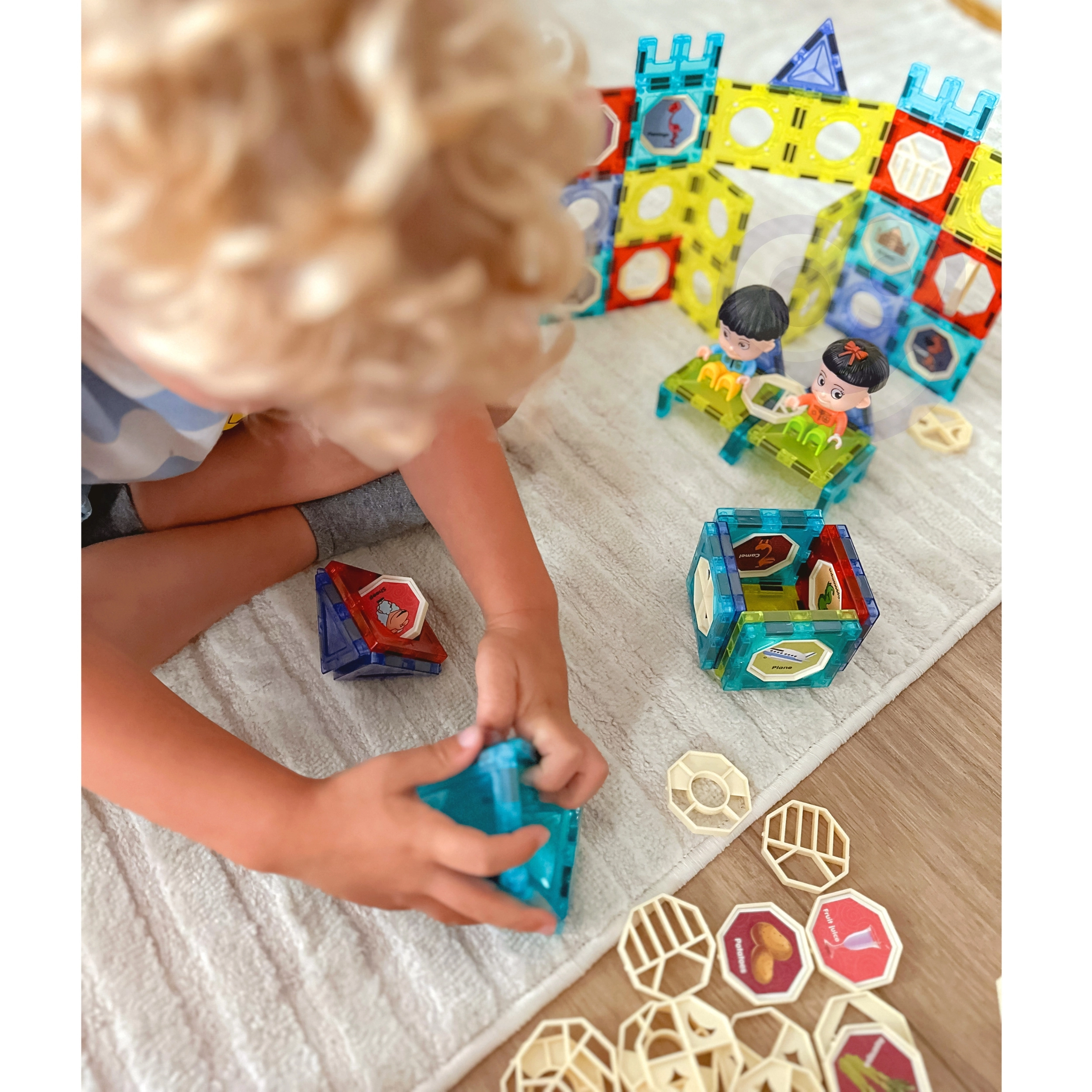 Stiprūs magnetai leidžia vaikams greitai statyti ir perdarinėti. Konstrukcijos išlaiko formą ir skatina toliau eksperimentuoti su formomis ir spalvomis.