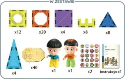 - Įvairios magnetinės detalės, 2 figūrėlės, lipdukai, instrukcija