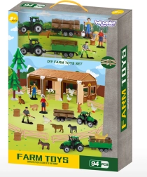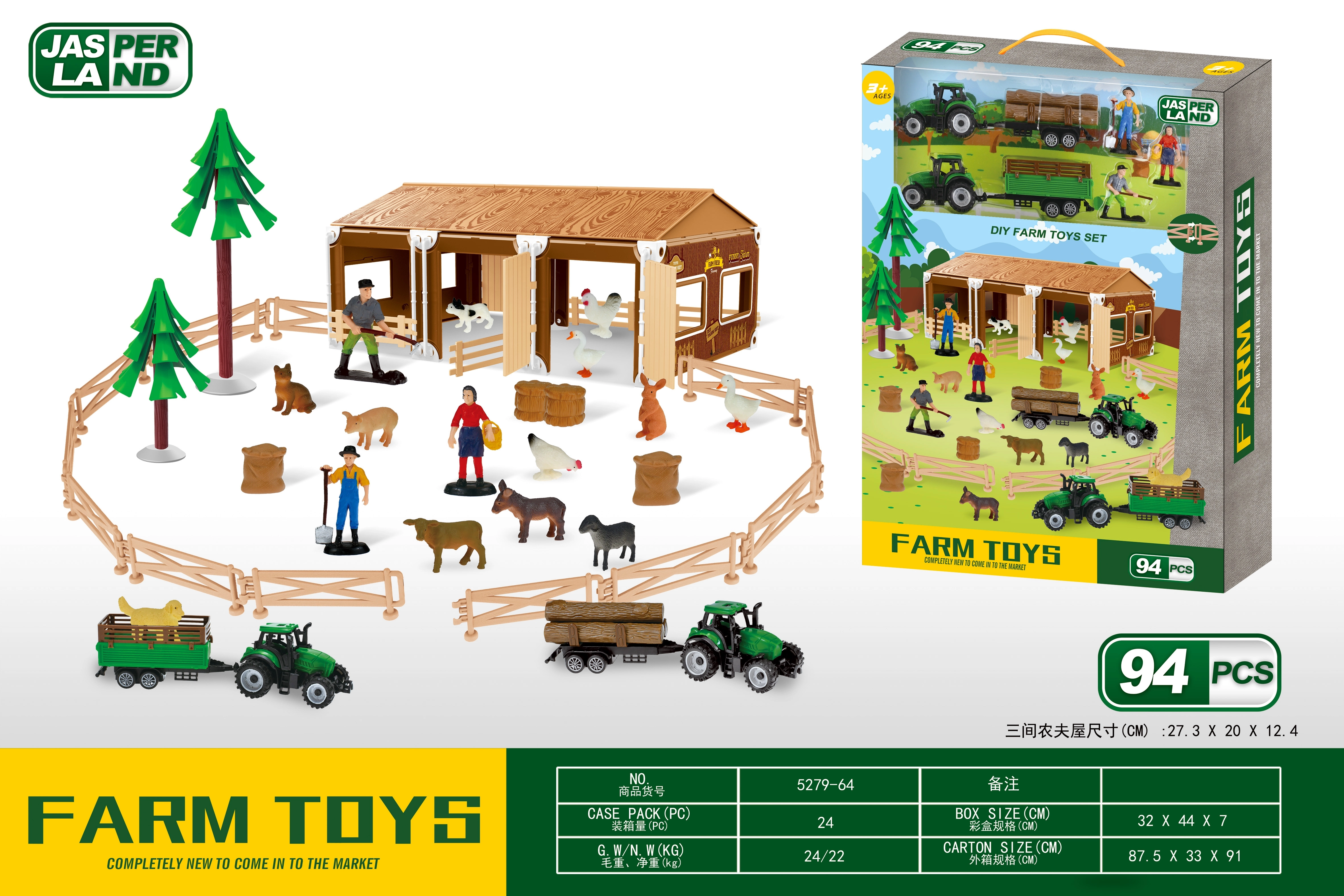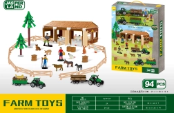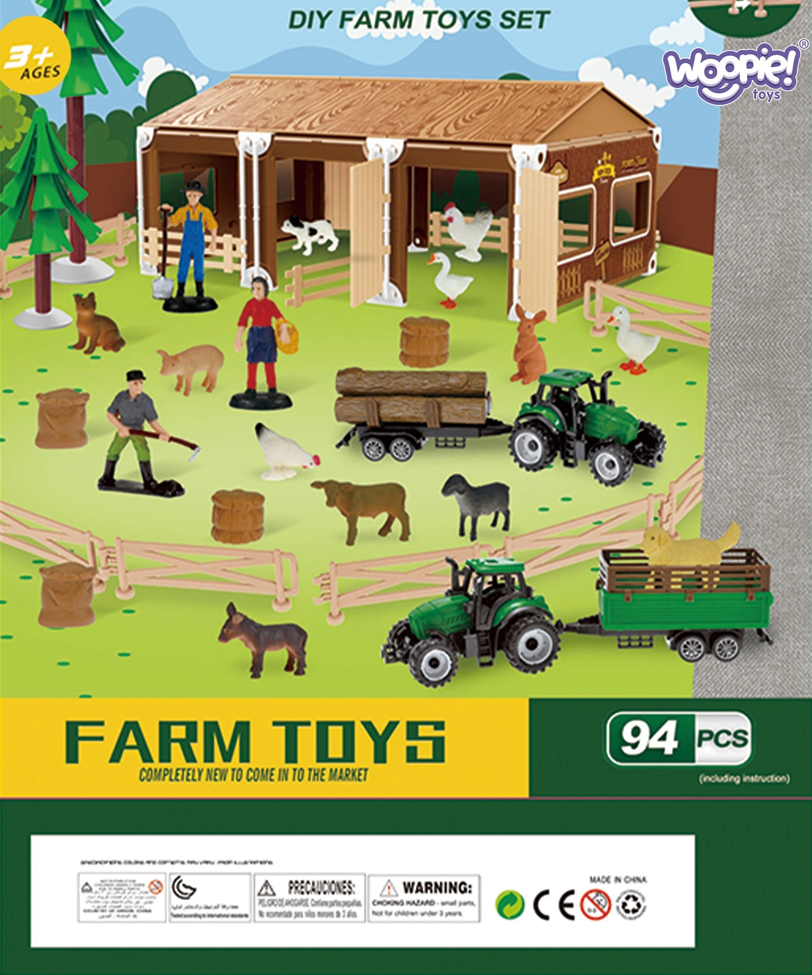 - 94 dalys ilgoms pramogoms: gyvūnai, žmonės, traktoriai, priekabos, tvartas, aptvarai ir priedai.