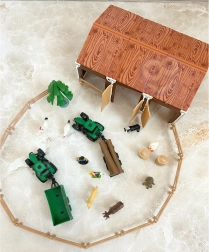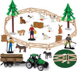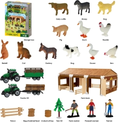 - 12 gyvūnų figūrėlių, 3 žmonių figūrėlės, 2 traktoriai su atjungiamomis priekabomis, tvartas/zagroda, aptvarai ir kiti ūkio priedai