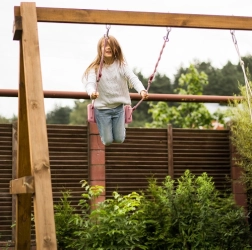 Tvirti lynai su tolygiu reguliavimu, maždaug 105–175 cm diapazone, leidžia lengvai pritaikyti sūpynes prie vaiko ūgio ir kabinimo vietos – nuo vaikų kambario iki sodo.
