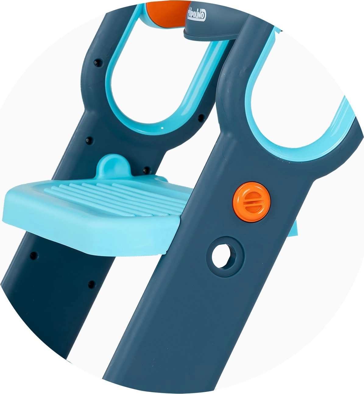 Chipolino Flippy blue antstatas su laipteliais sujungia tualeto dangtį ir pakojį viename, kad vaikai jaustųsi užtikrintai ir patogiai naudodamiesi tualetu. Neslystantys elementai, ergonomiški turėklai ir platus laiptelis užtikrina maksimalų stabilumą, o minkšta sėdynė suteikia komfortą net ilgesnio sėdėjimo metu.