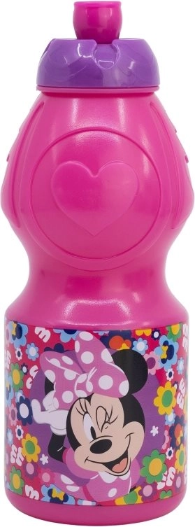 Rožinis plastikinis buteliukas su violetiniu dangteliu ir Minnie Mouse motyvu suteikia ne tik praktiškumo, bet ir estetikos vaikams.