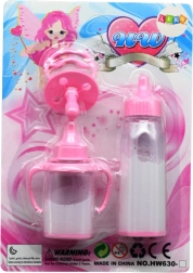 Rinkinyje yra du skirtingi buteliukai ir čiulptukas švelnios rožinės spalvos. Puikiai tinka vaidmenų žaidimams ir lėlyčių priežiūros imitacijai.