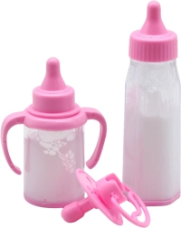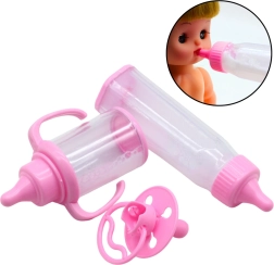 Žaislų rinkinys lėlėms – tai idealus papildymas šeimos vaidmenų ir kūdikio priežiūros žaidimams. Jame yra du buteliukai ir čiulptukas – visi švelnios rožinės spalvos. Buteliukuose yra skysčio, imituojančio pieną, kuris pakreipus dingsta, taip sukuriant realistišką maitinimo efektą.