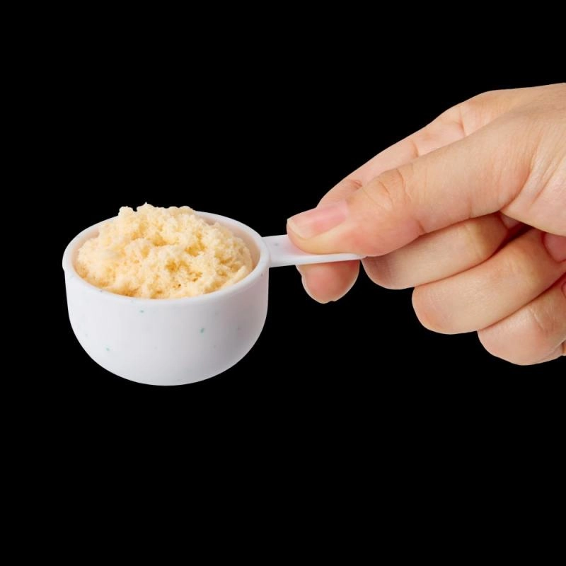 Tvirtas plastikinis puodelis su ergonomiška rankenėle ir matavimo žymomis moko vaikus įvertinti kiekius. Mentelė padeda maišyti ir serviruoti.