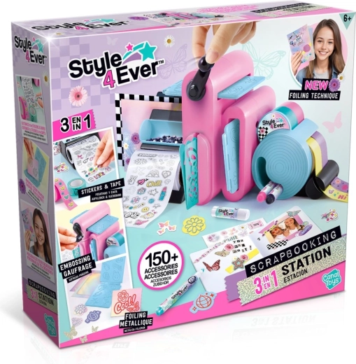 Kūrybinė studija 3 viename STYLE 4 EVER – tai daugiafunkcis dailės rinkinys vaikams nuo 6 metų, sujungiantis tris mėgstamas technikas: lipdukų gamybą, reljefinį spaudimą ir washi juostelių kūrimą/dekoravimą. Rankinė, pastelinių spalvų mašinėlė valdoma lengvai pasukamu ratuku ir leidžia kurti plastikinius raštus, originalius lipdukus bei personalizuotą dienoraščių puošybą.
