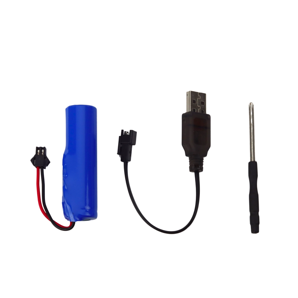 Komplekte yra 3,7 V ličio jonų baterija, USB laidas patogiam įkrovimui ir atsuktuvas greitai prieigai prie skyriaus.