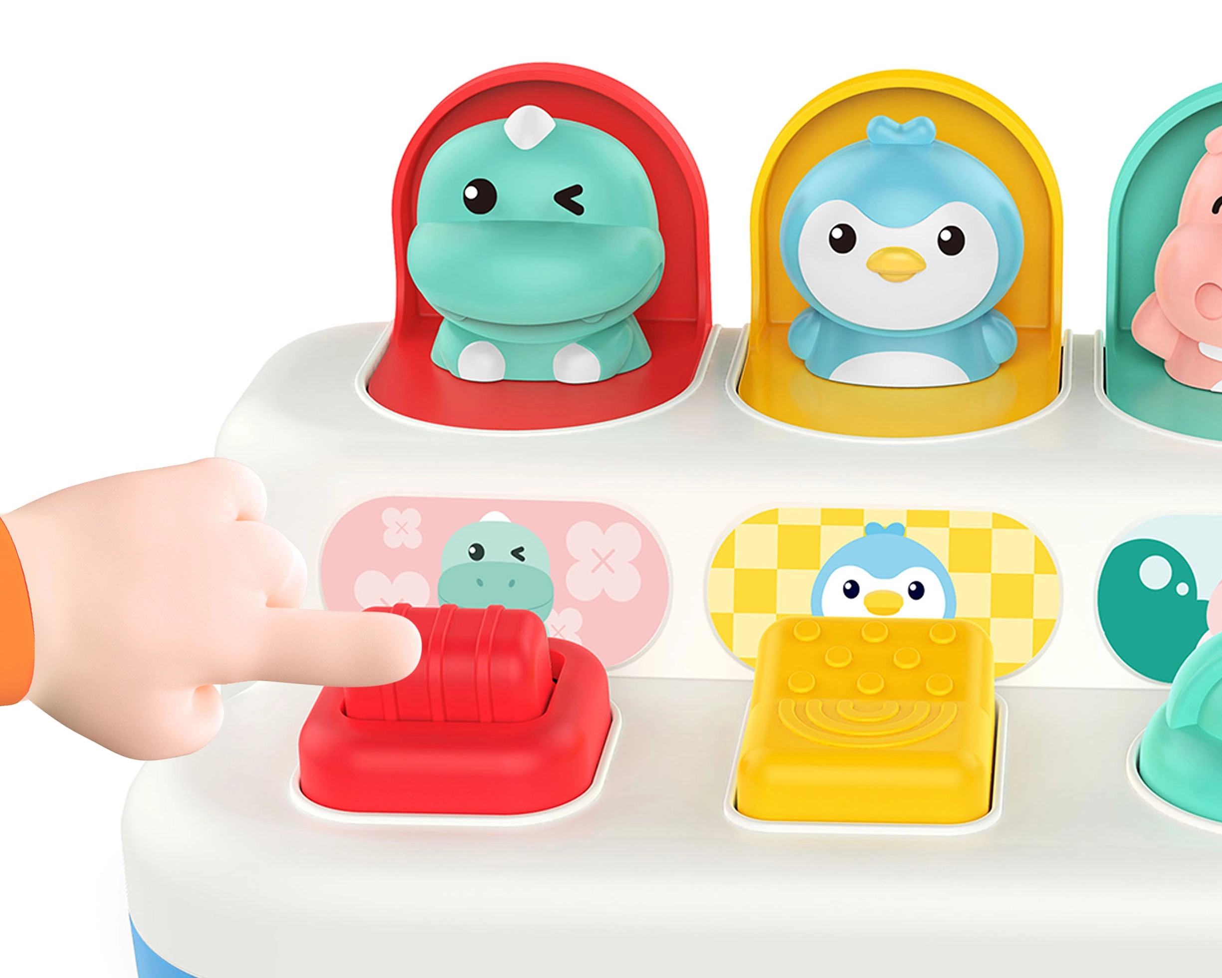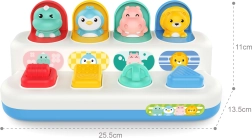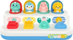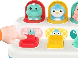 Linksmas ir patvarus interaktyvus žaislas mažiausiems: suaktyvinus jungiklį, ratuką arba mygtukus mielai iššoka gyvūnėliai. Puikiai tinka smulkiajai motorikai lavinti, priežasties–pasekmės ryšiui suprasti ir sensoriniam suvokimui.