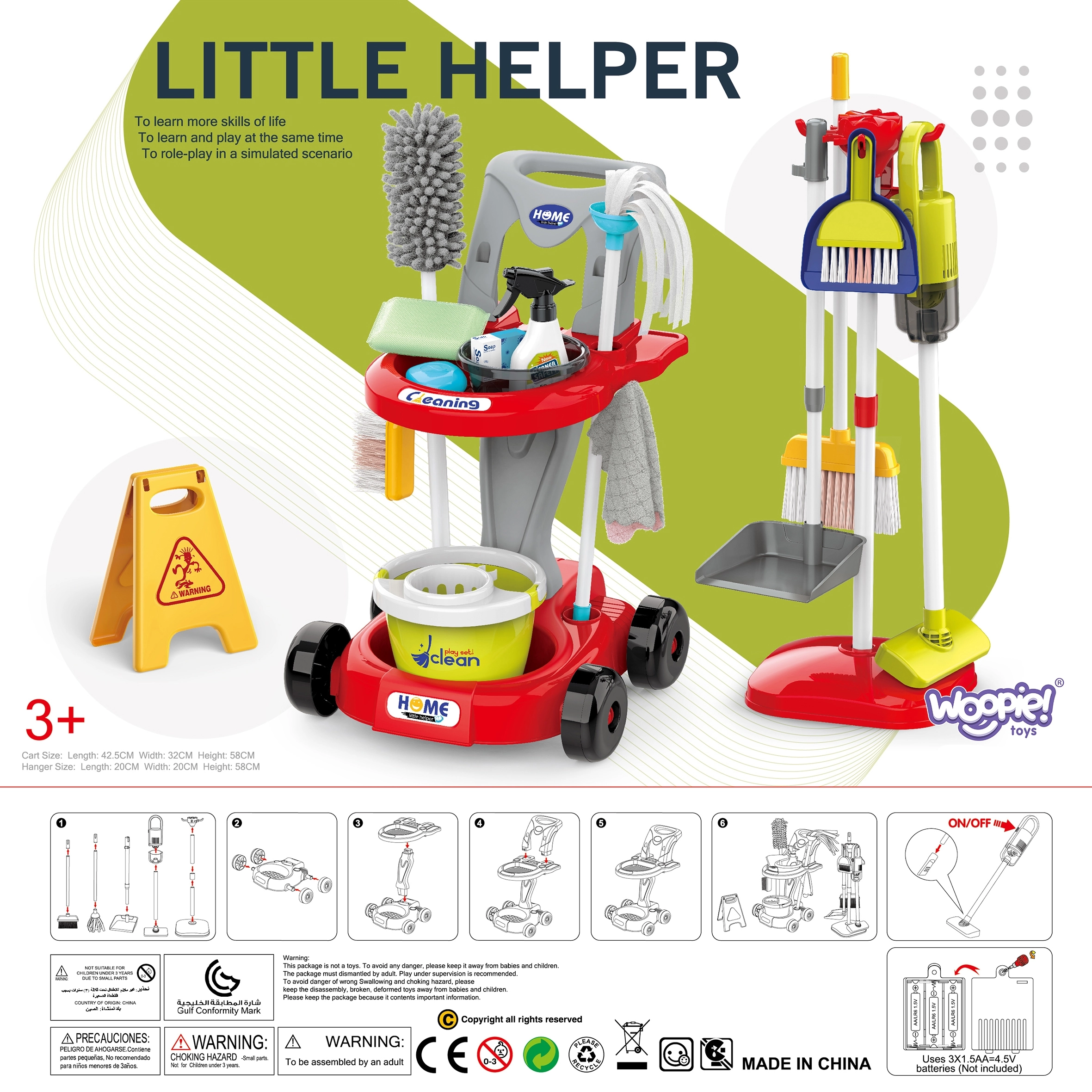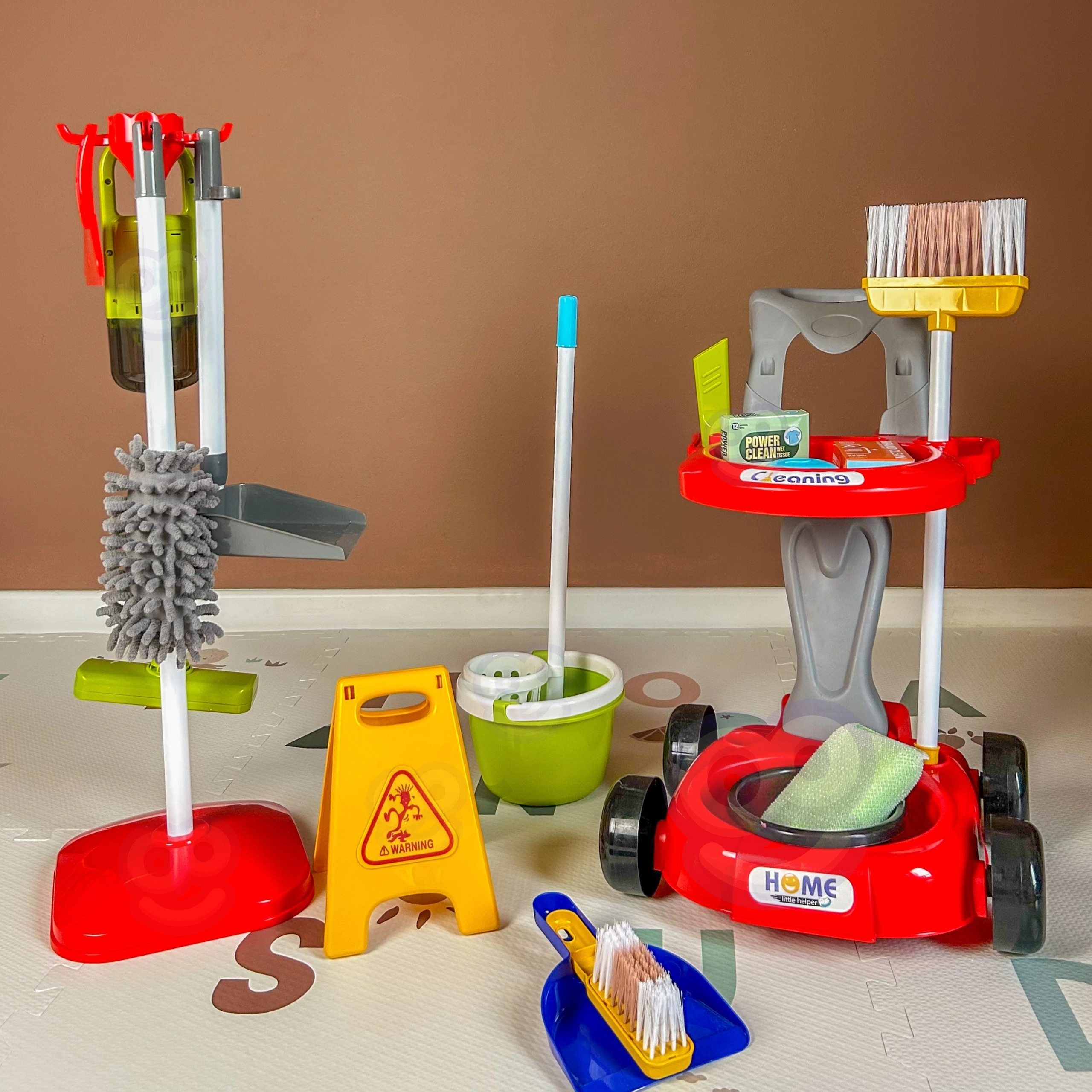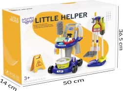 Rinkinyje yra viskas, ko reikia: ratukinis vežimėlis, mopas, šluota ir šepetėlis su semtuvėliu, kibiras, purkštuvas, skudurėliai, įspėjamasis ženklas „Dėmesio, slidi grindų danga“ ir kiti priedai. Daug elementų suteiks vaikams valandų valandas pramogų ir paskatins vaidmenų žaidimus bei bendradarbiavimą su broliais ir seserimis.