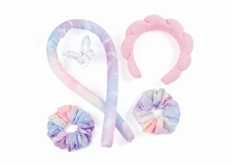Pakuotėje rasite bekarštę juostą, dvi scrunchies, drugelio segtuką ir pūkuotą lankelį – viskas spalviškai suderinta, kad formuoti būtų malonu.