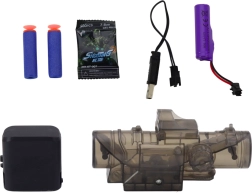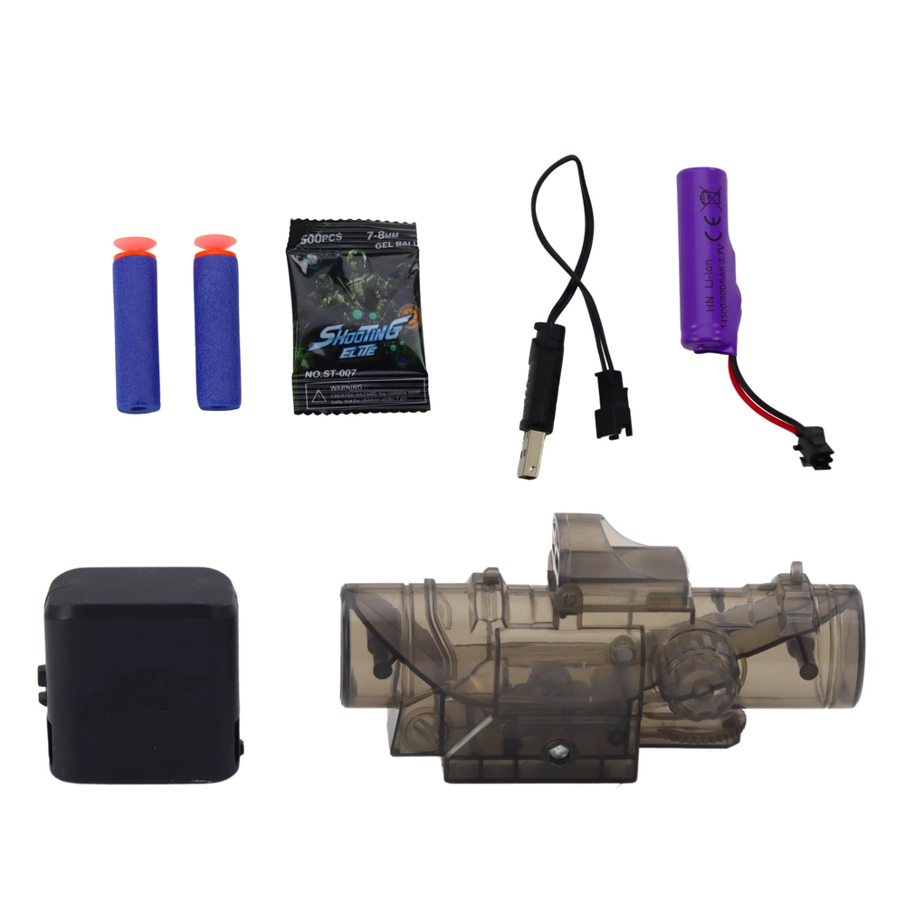 Šaudo gelinius (vandens) kamuoliukus ir minkštas putplasčio strėlytes. Pakuotėje taip pat rasite 3,7 V Li‑ion akumuliatorių, USB laidą, dėtuvę ir šaudmenų rinkinį greitam startui.
