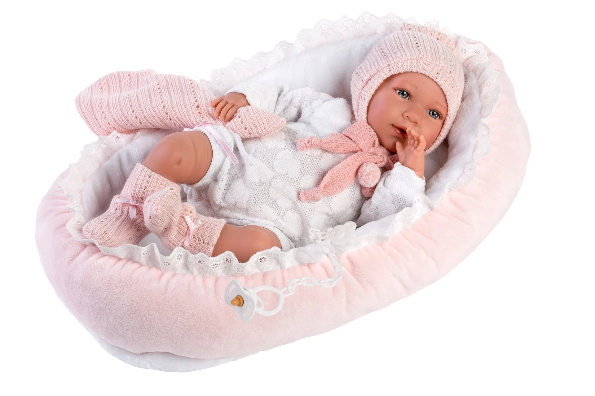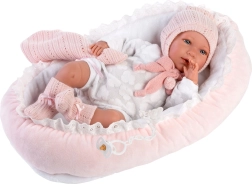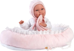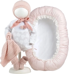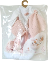 Drabužėliai lėlei kūdikiui, dydžio 40–42 cm, yra 4 dalių rinkinio dalis, į kurį įeina trys drabužių vienetai, dekoratyvinis migdukas ir lizdelis. Rankų darbo Ispanijoje, skirta vaikams nuo 3 metų.