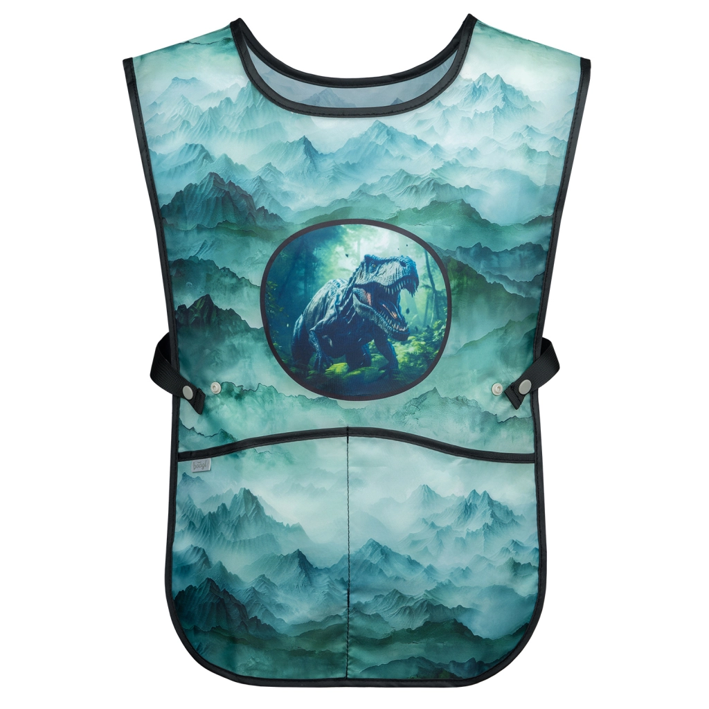 Vaikiška prijuostė DINO – praktiška prijuostė dailės pamokoms ar darbams, su dviem kišenėmis.