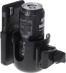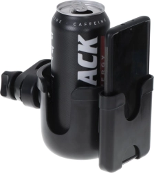 Šis laikiklis tinka įvairių tipų buteliams, bidonams, termosiukams ir telefonams. Keturios elastingos „auselės“ užtikrina saugią gėrimų fiksaciją be išsiliejimo baimės. Atviros šoninės dalys leidžia lengvai pasiekti turinį. Telefono pertvara leidžia laikyti įrenginį matomoje vietoje, kad nepraleistumėte svarbių žinučių.