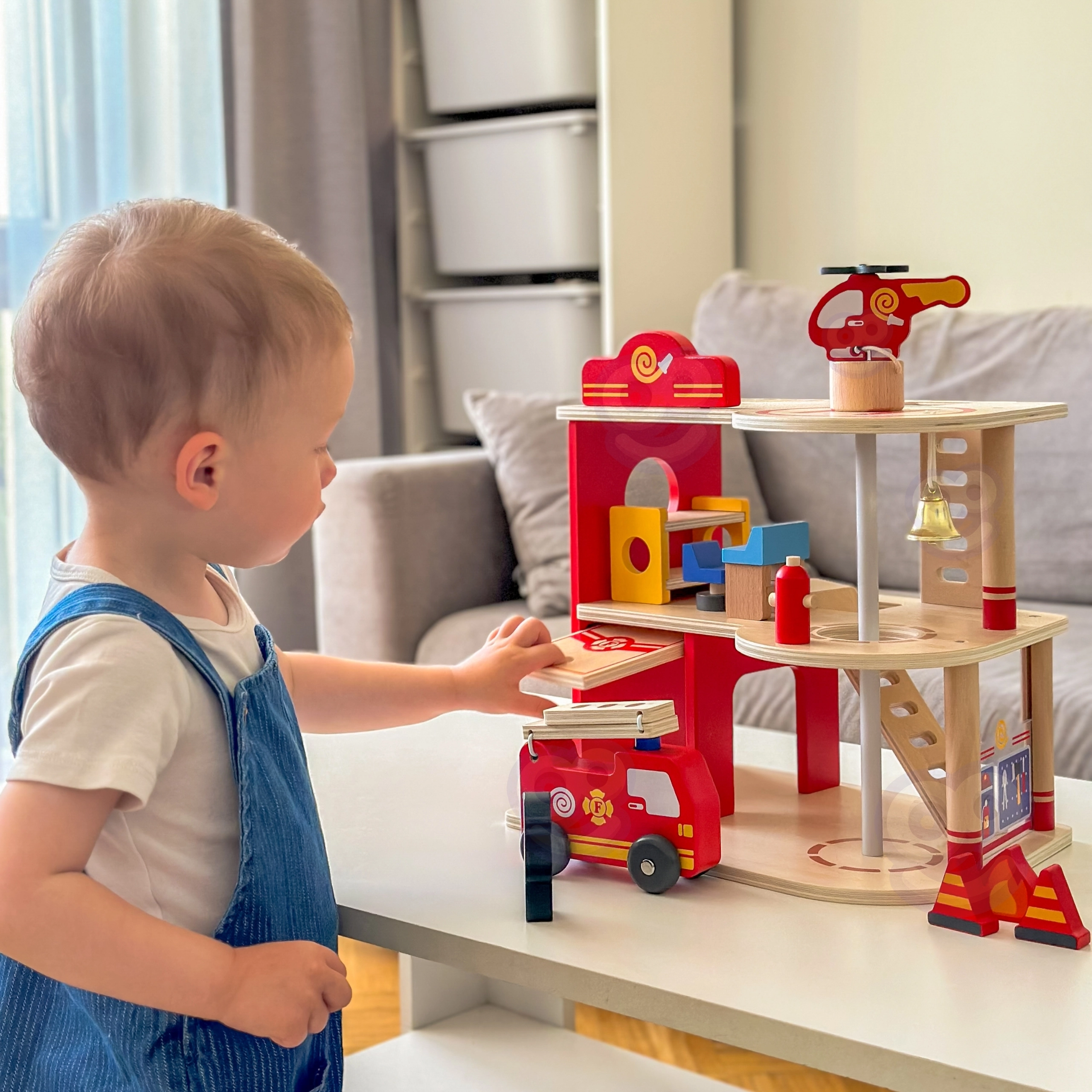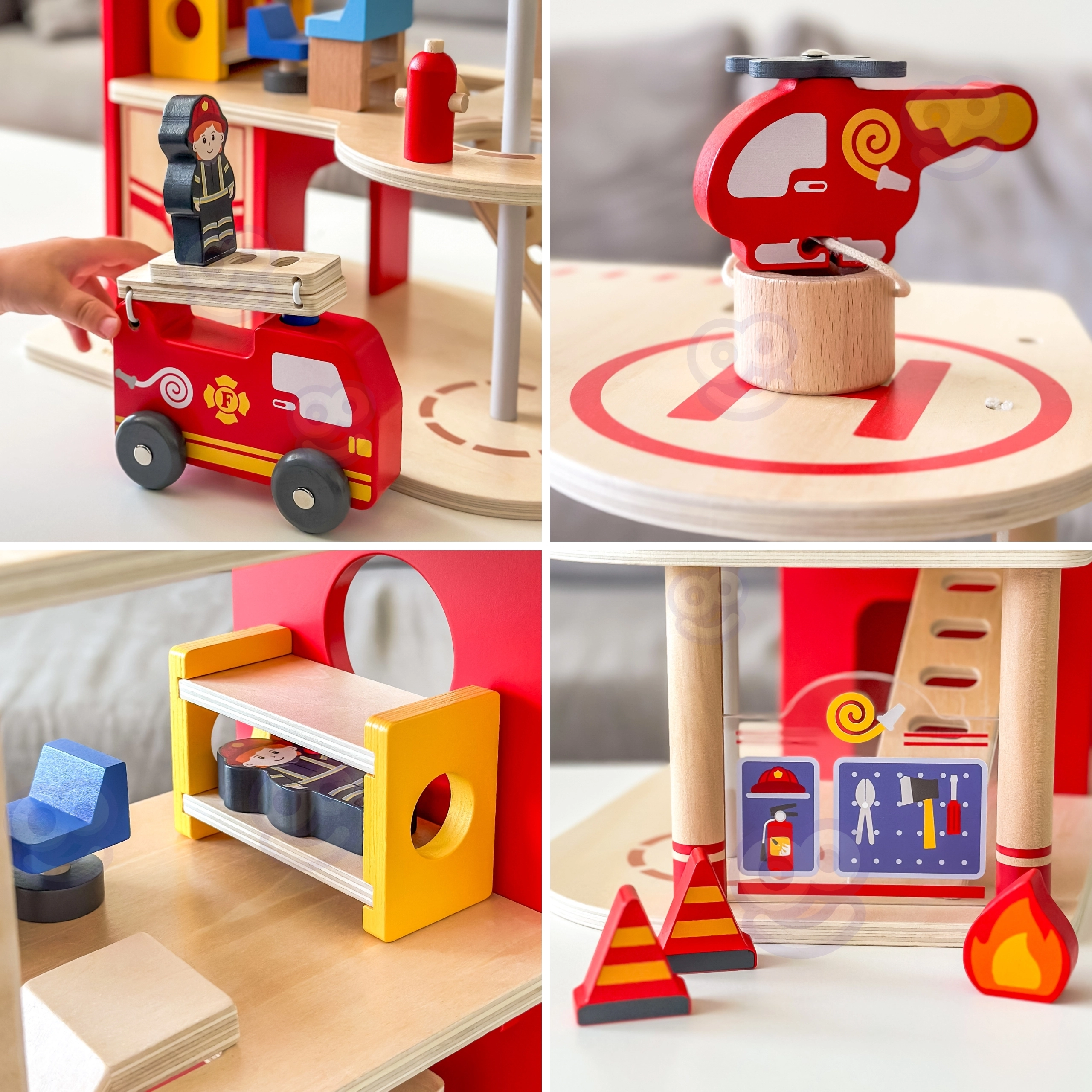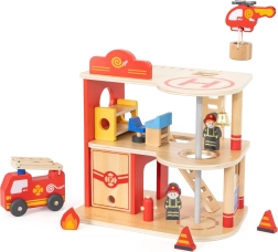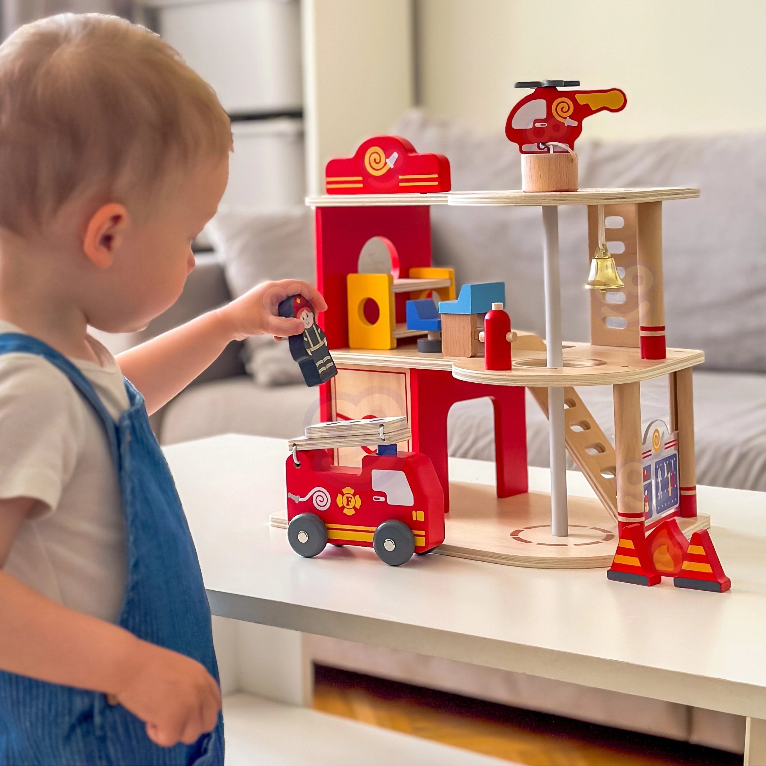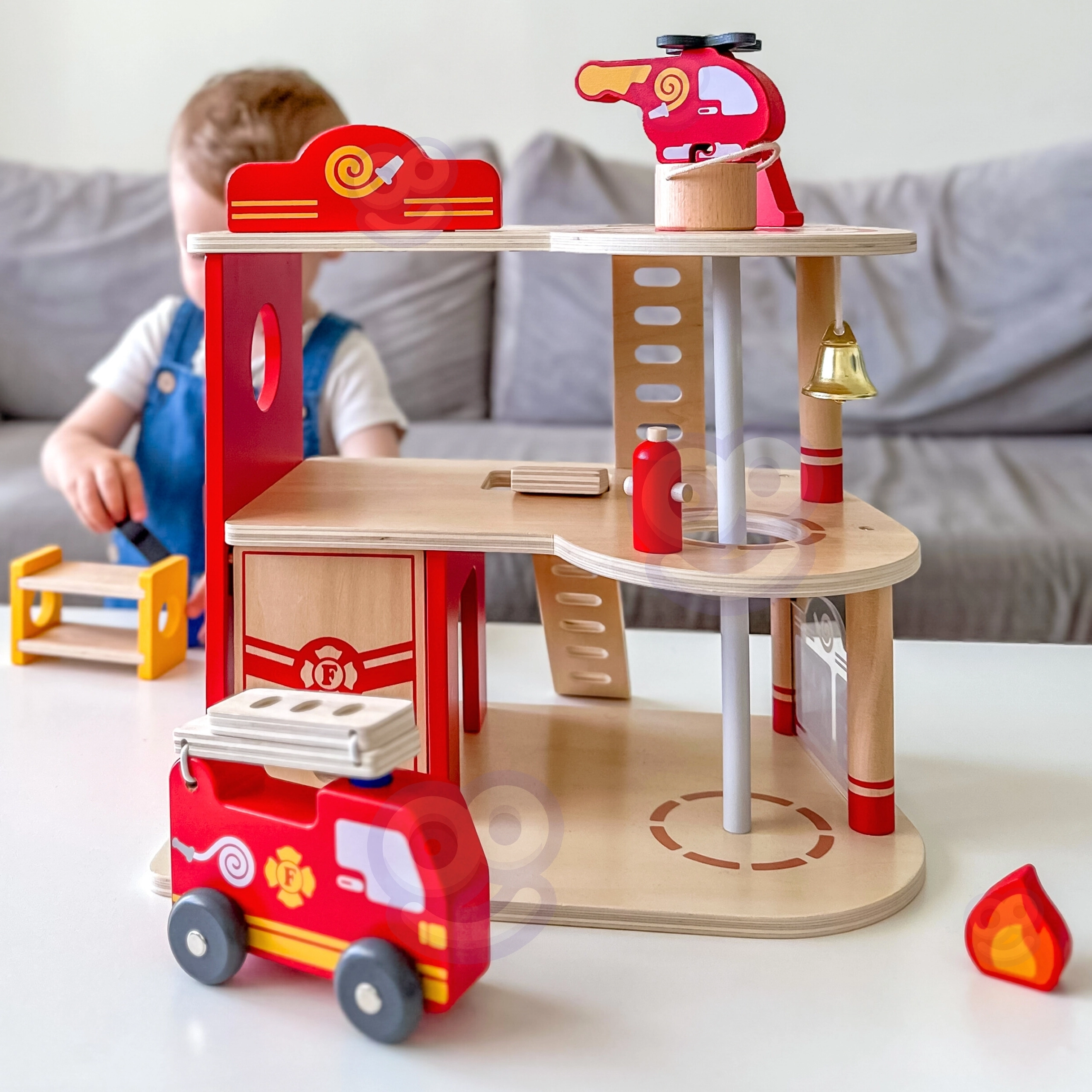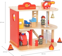 Ši tvirta medinė gaisrinės stotis su trimis aukštais suteikia vaikams nuo 3 metų valandų valandas dinamiško žaidimo. Pirmajame aukšte yra gaisrinės automobilio garažas ir vieta įrangai, antrajame – jauki poilsio zona su skambučiu ir greito nusileidimo stulpu, trečią aukštą vainikuoja heliportas gaisrinės sraigtasparniui.