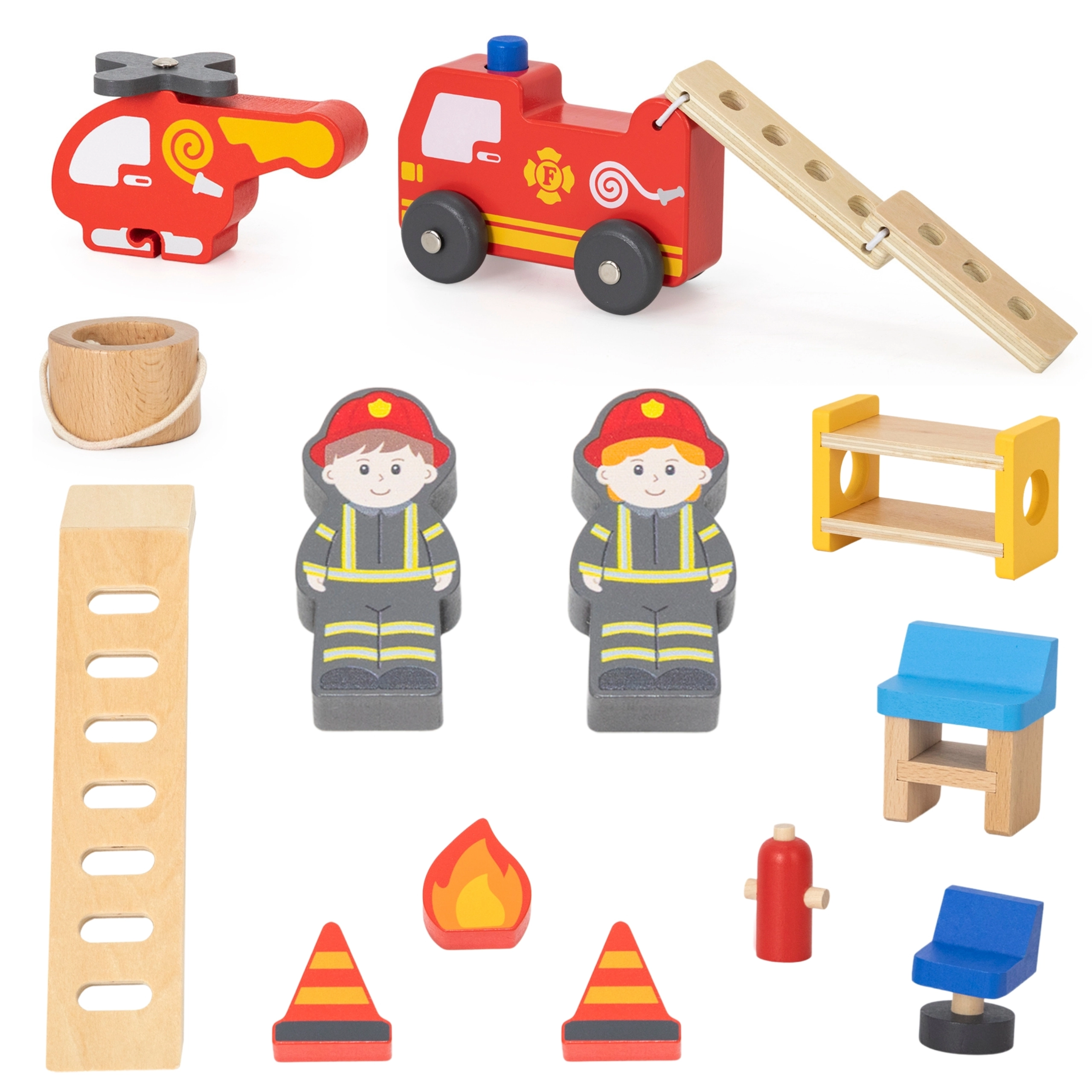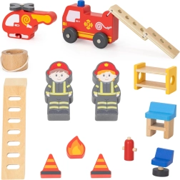 Rinkinyje rasite viską įtraukiantiems nuotykiams: gaisrinės automobilį, sraigtasparnį su vandens talpa, 2 gaisrininkų figūrėles, liepsną „gesinimui“, kliūčių kūgius, gesintuvą ir baldus (lovą, stalą, kėdę). Kokybiška mediena, lygūs kraštai ir sodrios spalvos užtikrina saugų ir ilgaamžį žaidimą.