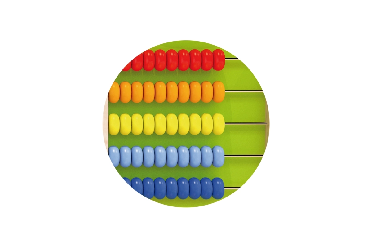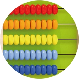 Penki ryškių spalvų karoliukų eilės natūraliai veda vaikus prie skaičių pažinimo, sudėties ir atimties linksma forma.