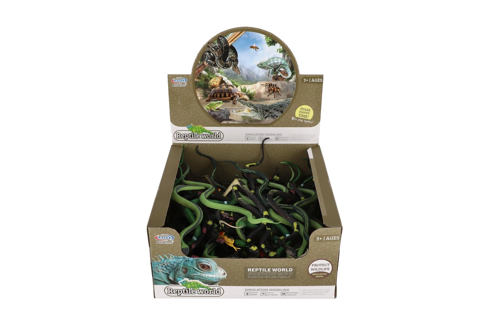 Kiekviena gyvatė turi ryškią „žvynų“ tekstūrą, sodrias spalvas ir skirtingus raštus, suteikiančius autentišką išvaizdą. Puikiai tinka pažinimui ir teminiams žaidimams.