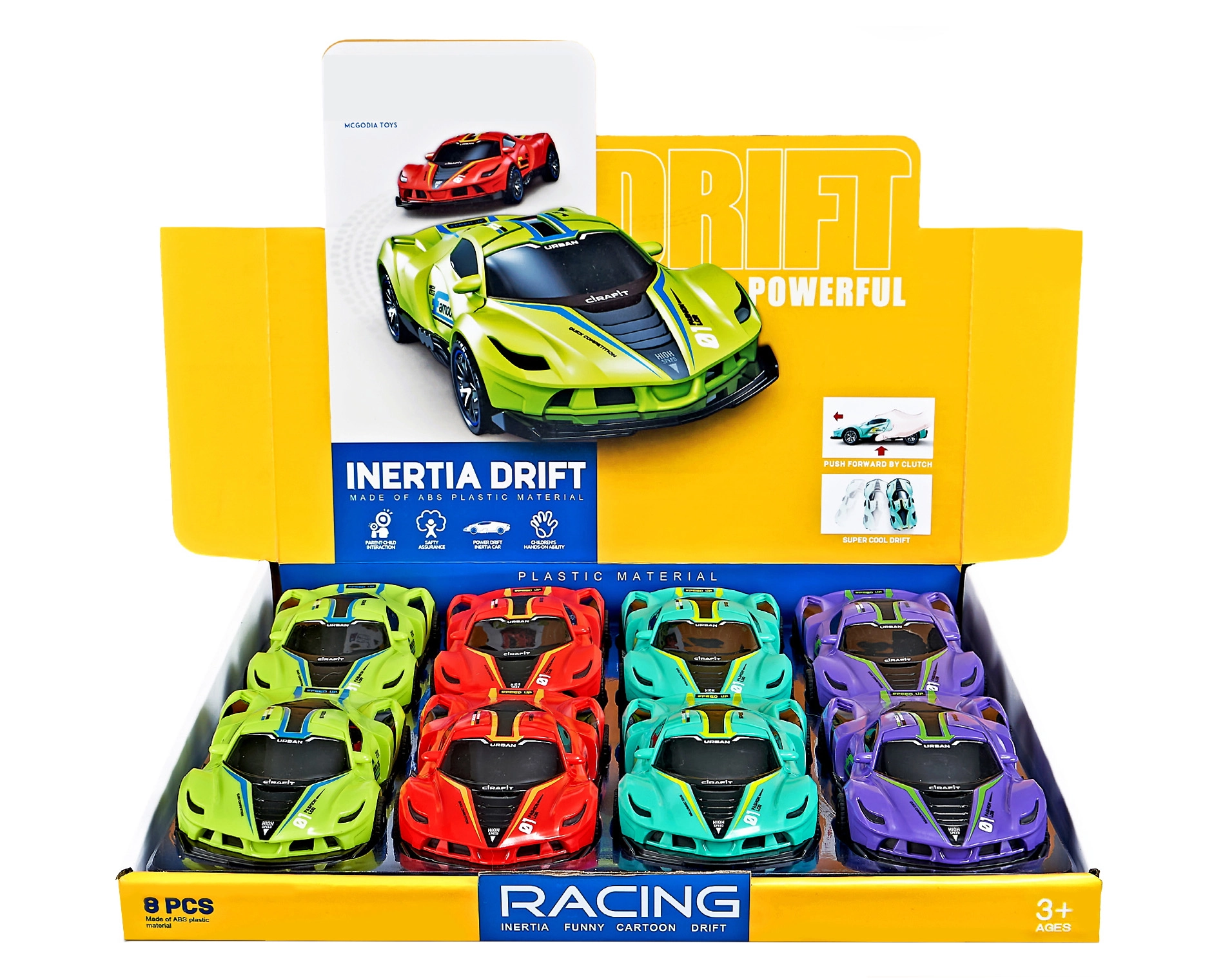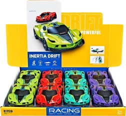 Drifto inercinis automobilis, kurio matmenys 15,5 x 8 x 4 cm, yra idealus pasirinkimas visiems dinamiško važiavimo gerbėjams. Šis modelis prieinamas keturių skirtingų spalvų – žalios, raudonos, mėlynos ir violetinės.