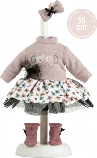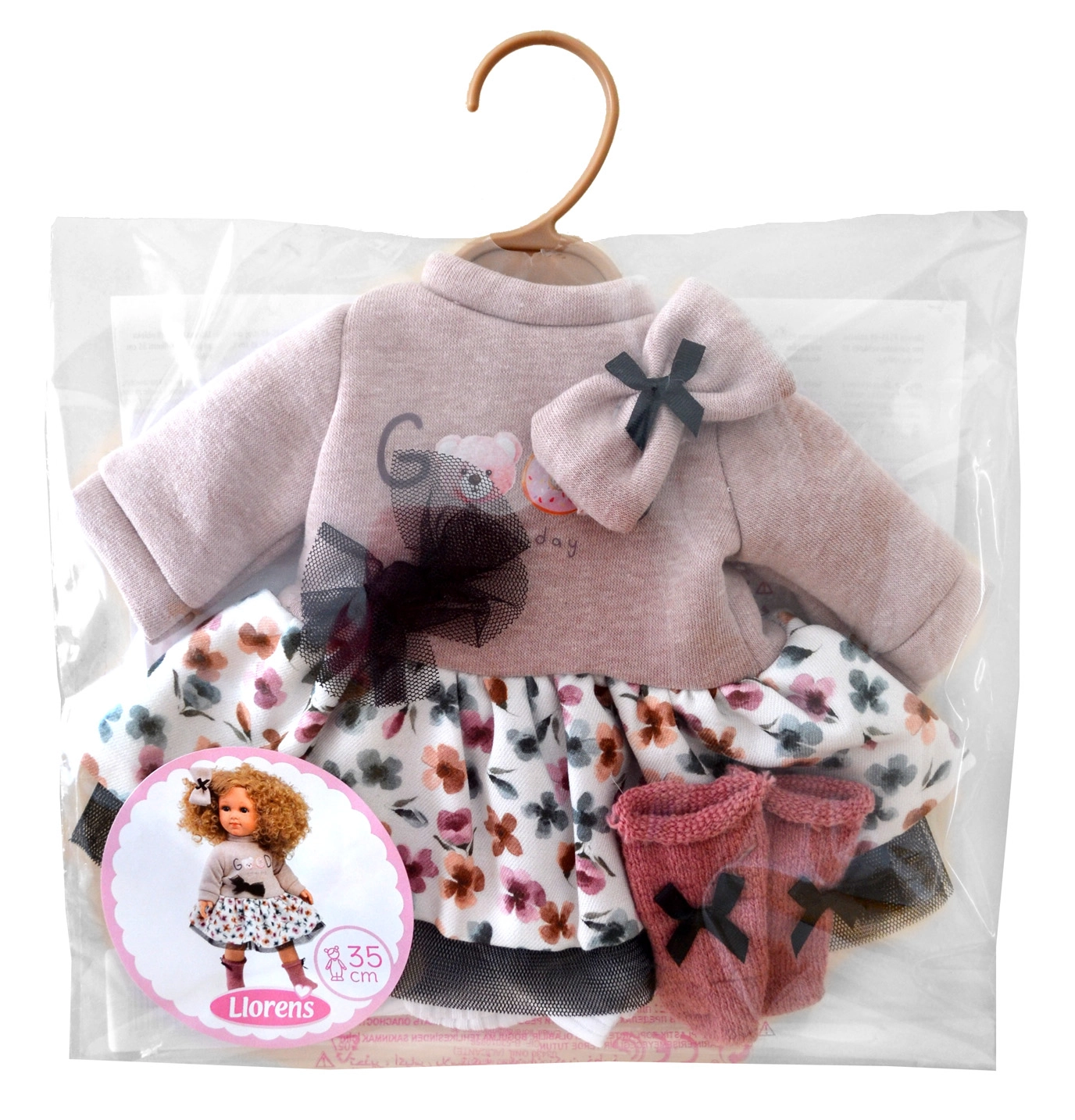 Rinkinį sudaro ilgarankovė palaidinė su kaspinu ir tiulio akcentu, gėlėtas sijonas su tiulio krašteliu, minkštos kojinaitės su kaspinėliais ir dekoratyvinė plaukų gumelė. Dėl universalios dydžio proporcijos lengvai tinka 35 cm aukščio lėlėms ir skatina kūrybišką žaidimą.