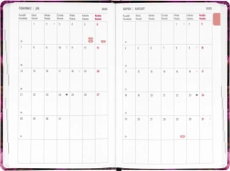 Aštuoniolikos mėnesių dienoraštis su elegantišku violetinių gėlių dizainu. Puikiai tinka planuoti laiką nuo 2025 m. liepos iki 2026 m. gruodžio.