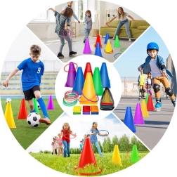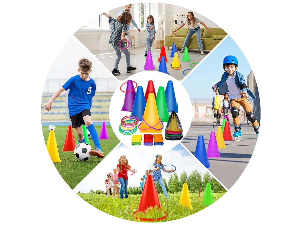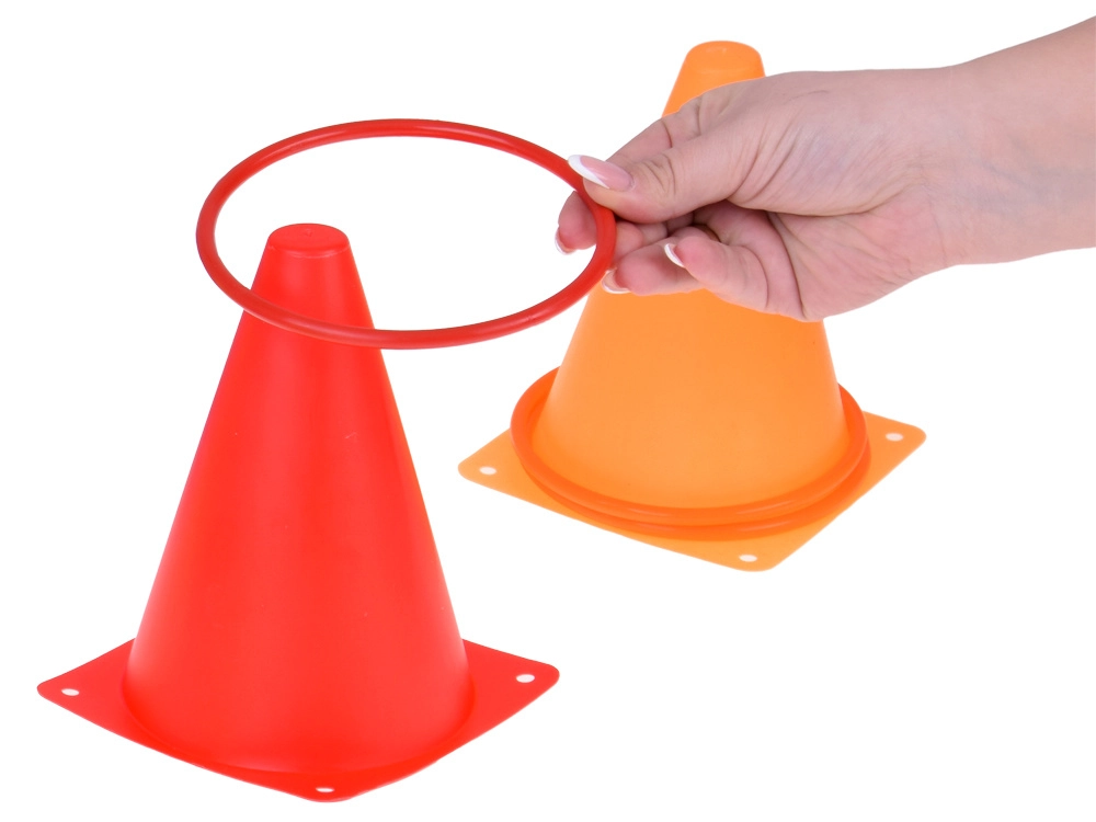 Šiame rinkinyje yra ryškių spalvų kūgiai ir lankai, kurie patraukia dėmesį ir užtikrina smagų žaidimą. Puikiai tinka aikštelės ar stotelių žymėjimui.