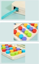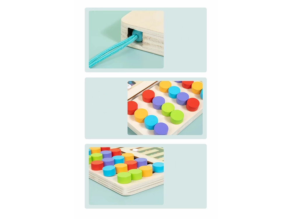 Medinė žaidimų lenta turi įvairių raštų, padedančių lengvai mokytis spalvų ir koordinacijos. Skatina vaikų kūrybiškumą ir susikaupimą.