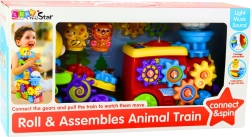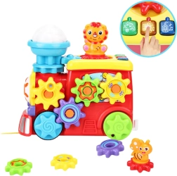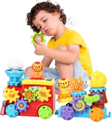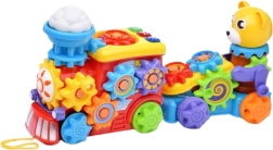 Linksmasis traukinukas su priekaba ir meškiuku sukurtas taip, kad ne tik linksmintų, bet ir lavintų vaiko smulkiąją motoriką, dėmesį bei vaizduotę nuo pirmųjų žaidimo akimirkų. Žaislas turi besisukančius krumpliaračius, kurie įtraukia vaiko rankytes ir padeda lavinti tikslius judesius. Šviesos ir garso efektai stimuliuoja pojūčius ir supažindina vaiką su audiovizualiniais dirgikliais. Traukinuko viduryje yra judantis debesėlis, o prieš priekabą – bitė, kuri suaktyvinama pasukus specialią meškiuko rankenėlę.