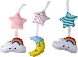 Rinkinyje yra trys pliušiniai kabinami žaisliukai – mėnulis, debesėlis ir žvaigždė – sukurti atsižvelgiant į saugumą ir jutiminę stimulaciją patiems mažiausiems. Švelniai liečiamos figūrėlės pastelinių spalvų padeda lavinti vaiko regą, lytėjimą ir judesių koordinaciją. Karuselė žadina smalsumą ir suteikia jaukumo pojūtį bet kuriomis aplinkybėmis.