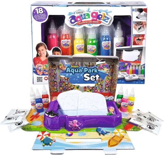 Aqua Park rinkinys išskleidus tampa spalvingu akvaparku su žaidimų scena. Dėl patogaus dozavimo iš buteliukų ir daugkartinių formelių kūryba yra paprasta, švari ir įtraukianti – puikiai tinka namų veikloms ir kaip dovana.