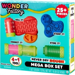 Rinkinyje Wonder Factory Never Dry Dough Mega Box rasite mūsų specialų plastiliną, kuris niekada neišdžiūsta, yra draugiškas aplinkai ir nuostabiai kvepia. Taip pat pridedamas universalus 4 viename įrankis, su kuriuo galite:
