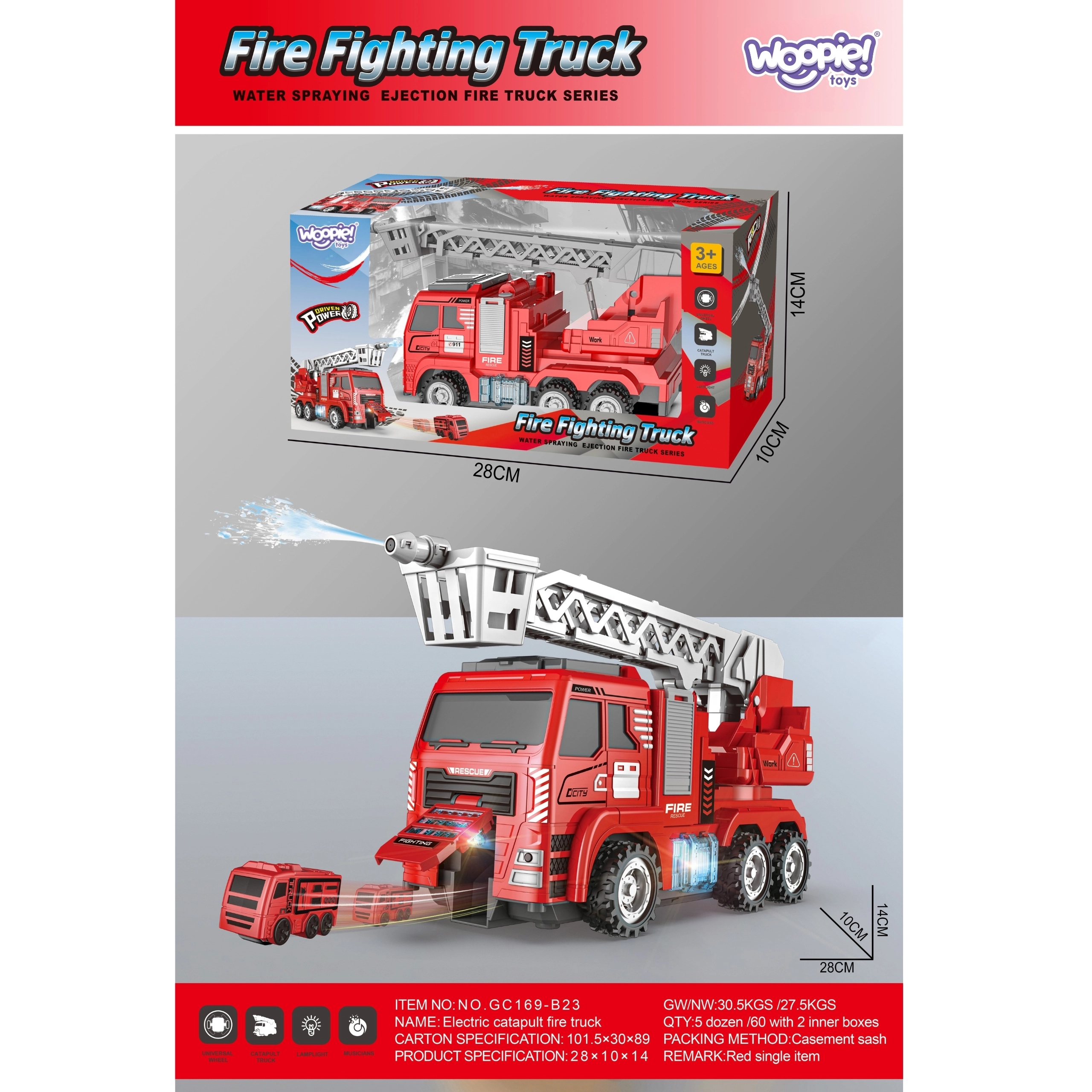 Interaktyvus gaisrinės automobilis mažiesiems gelbėjimo transporto priemonių gerbėjams. Kruopščiai pagamintas žaislas su ištraukiamomis kopėčiomis ir vandens patranka, imituojantis tikrą gaisrinį automobilį.