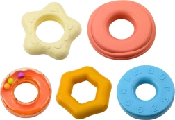 Kiekvienas žiedas turi skirtingą tekstūrą, o vienas iš jų – su barškučiu. Taip žaislas suteikia įvairius garsinius ir jutiminius dirgiklius, kurie skatina suvokimo ir susikaupimo raidą. Visos dalys pagamintos iš saugių, patvarių, be kenksmingų medžiagų medžiagų, visiškai tinkamų patiems mažiausiems.