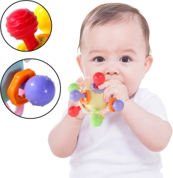 Integruotas barškučiukas švelniai skamba judant, kas skatina klausos vystymąsi ir patraukia vaiko dėmesį. Kompaktiškas dydis ir mažoms rankytėms pritaikyti laikikliai leidžia lengvai suimti, sukti ir spausti, taip lavinant koordinaciją ir sugriebimo jėgą.
