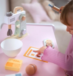 Atraskite kepimo magiją su mediniu maišytuvu švelnių pastelinių spalvų, kuris leidžia vaikams mėgdžioti suaugusiųjų pasaulį. Nuo mygtuko sukimo iki maišymo dubenyje – realistiškos detalės ir saugūs suapvalinti elementai iš kokybiškos medienos daro jį idealiu priedu kiekvienai vaikų virtuvėlei.