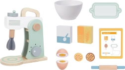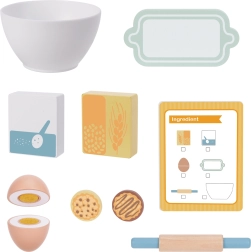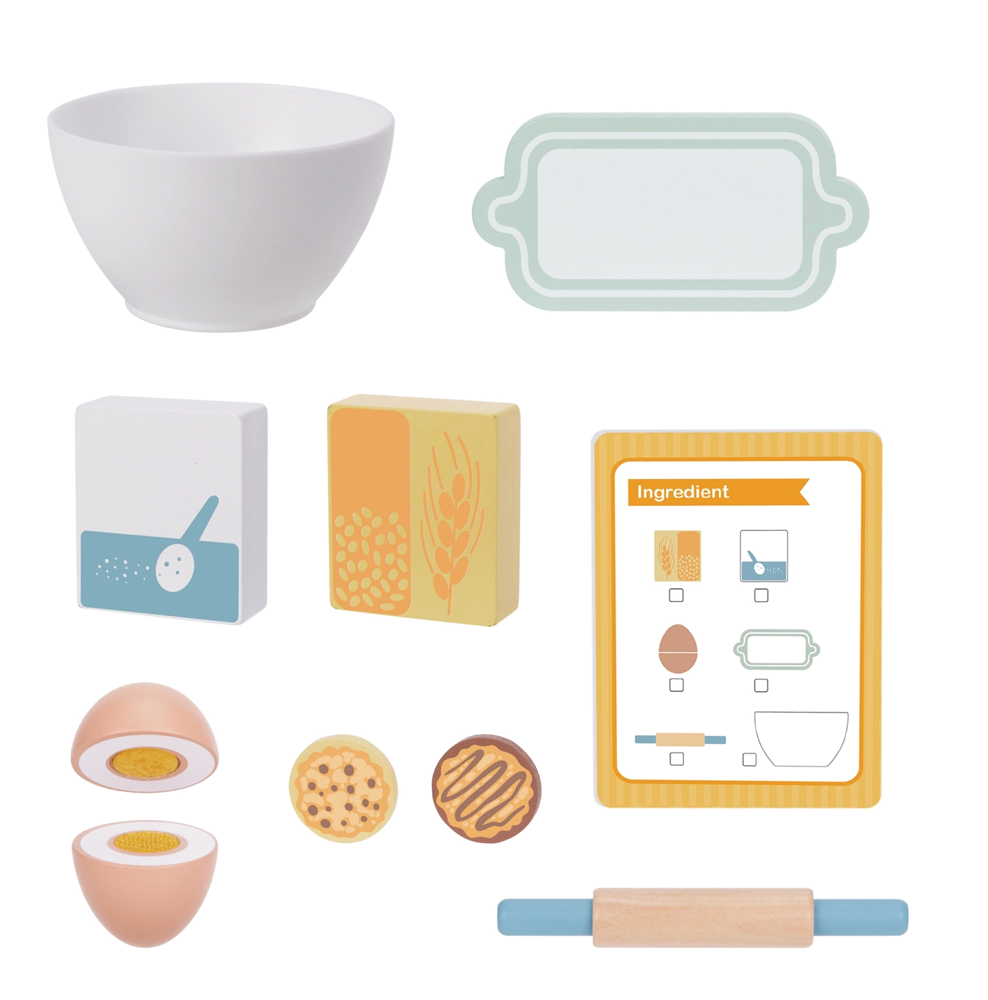 Komplekte yra pilnas priedų rinkinys: dubuo, miltai, cukrus, kiaušinis su lipuku, kočėlas, kepimo skarda, sausainiai ir receptas. Žaidimas lavina kūrybiškumą, vaizduotę, rankų įgūdžius ir koncentraciją – ir visa tai be ekranų.