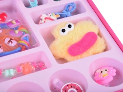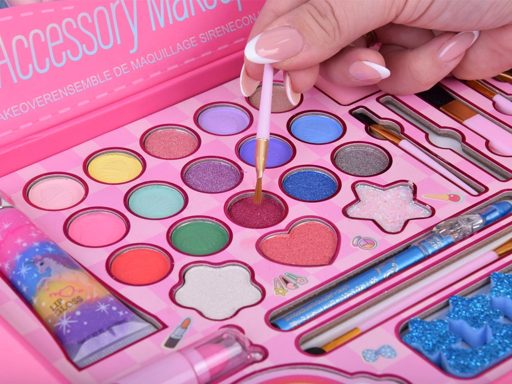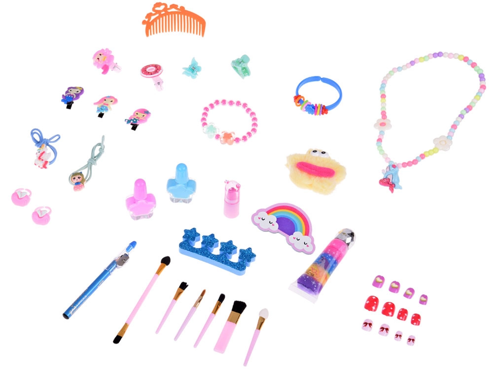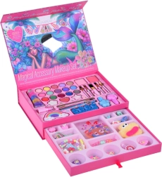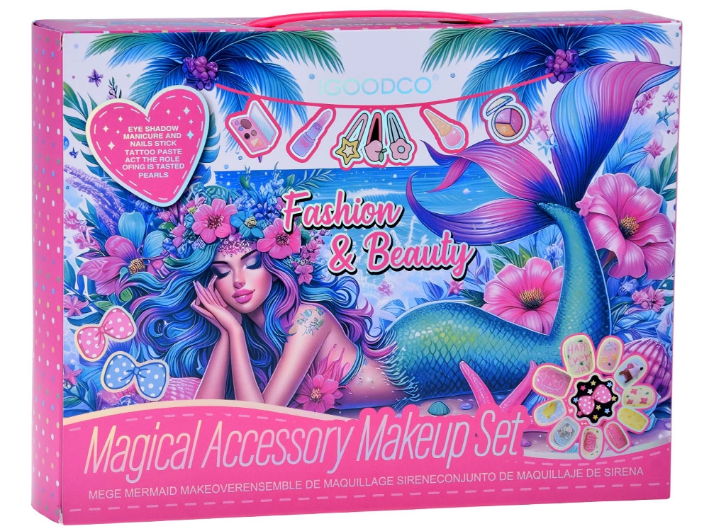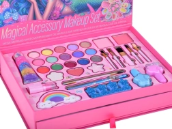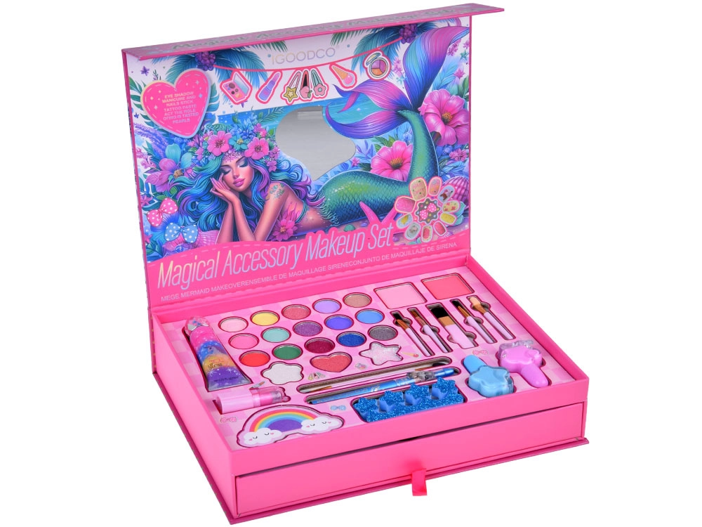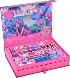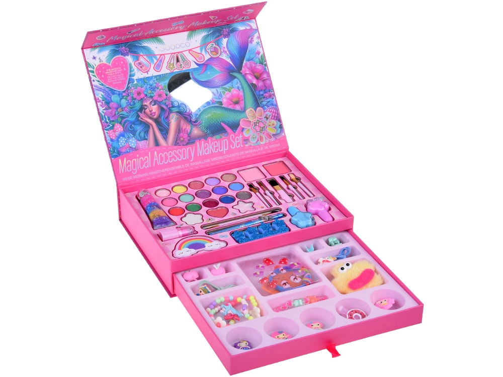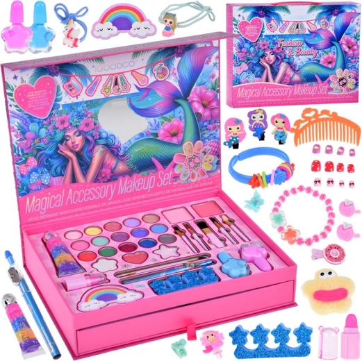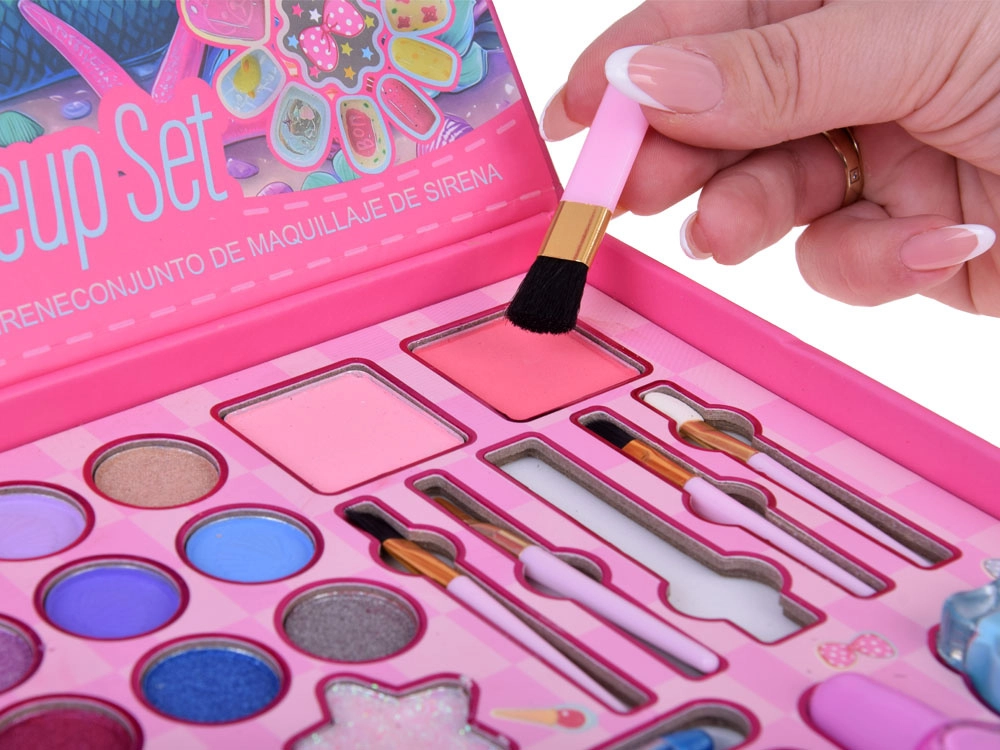 Atidarius – tikras stebuklas! Bet nebijokite – pačia geriausia prasme! :) Viduje rasite kiekvienos makiažo gerbėjos svajonių išsipildymą! Be to, lagaminėlyje yra stalčiukas, pilnas plaukų aksesuarų ir papuošalų. Beveik kiekvienas daiktas turi undinėlės motyvą arba elementą, susijusį su saldžiu, mergaitišku pasauliu.